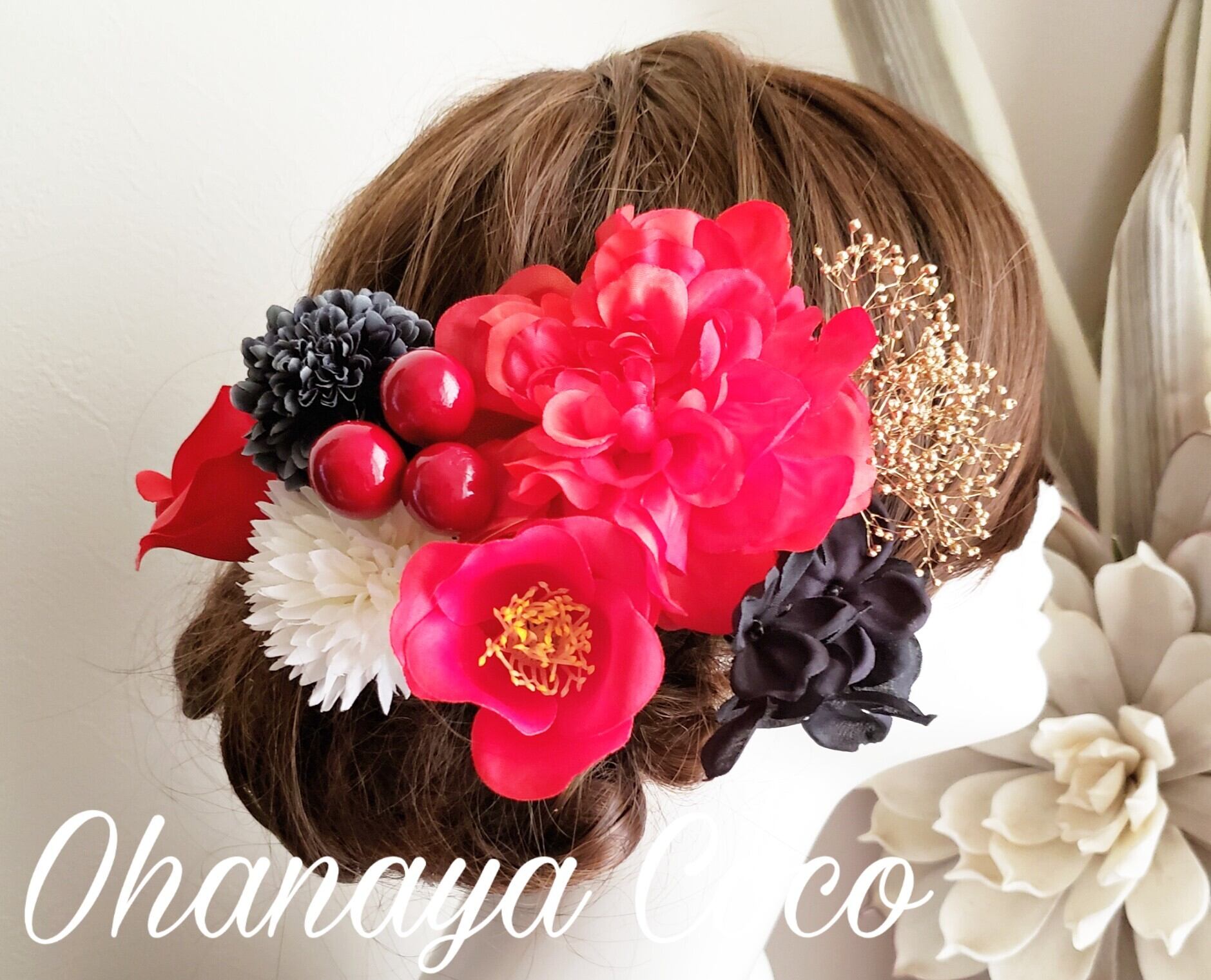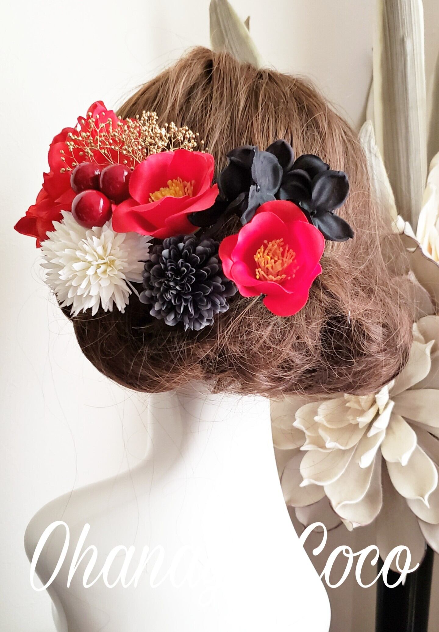 こちらの商品は赤いダリアと椿の髪飾り8点Setです。