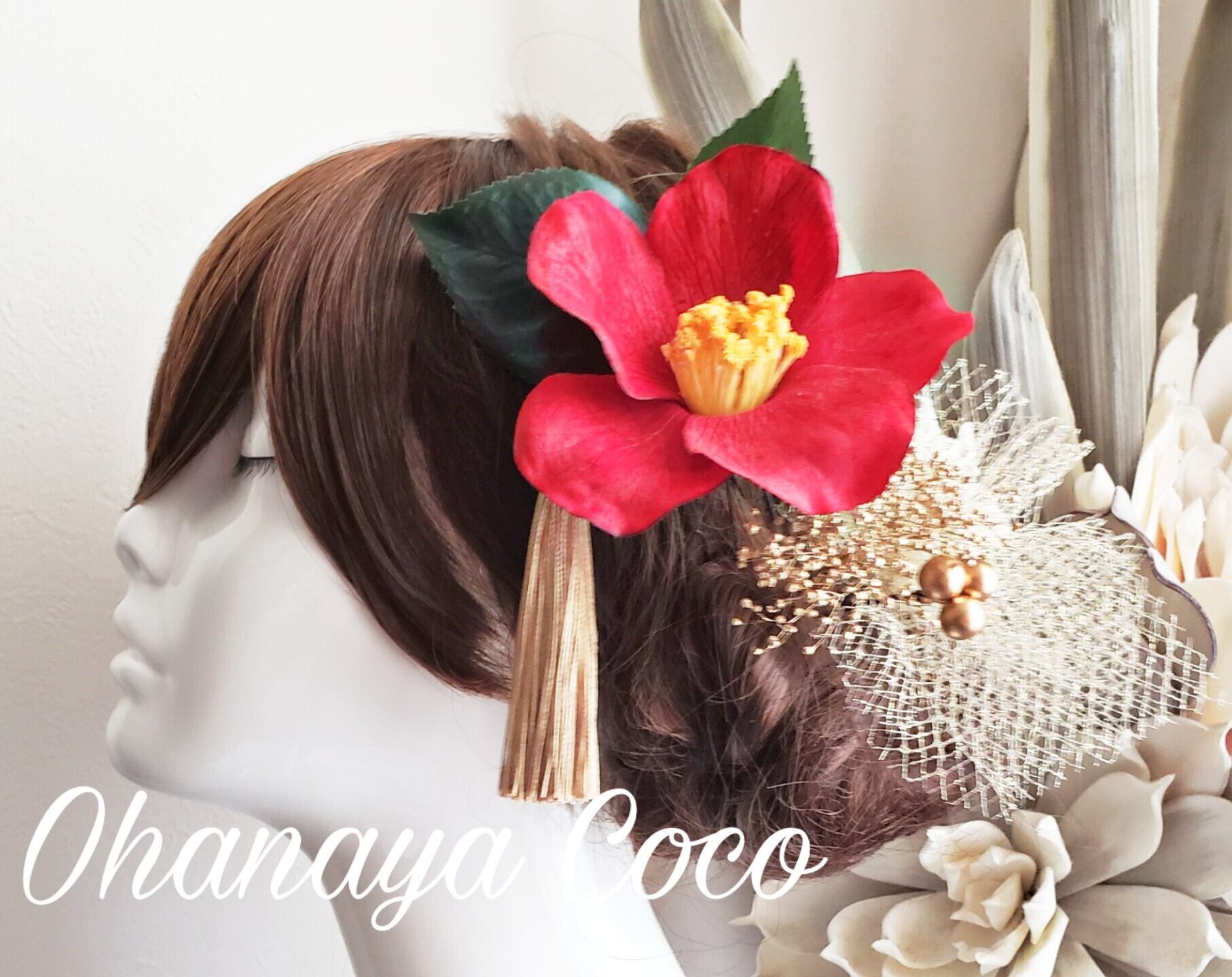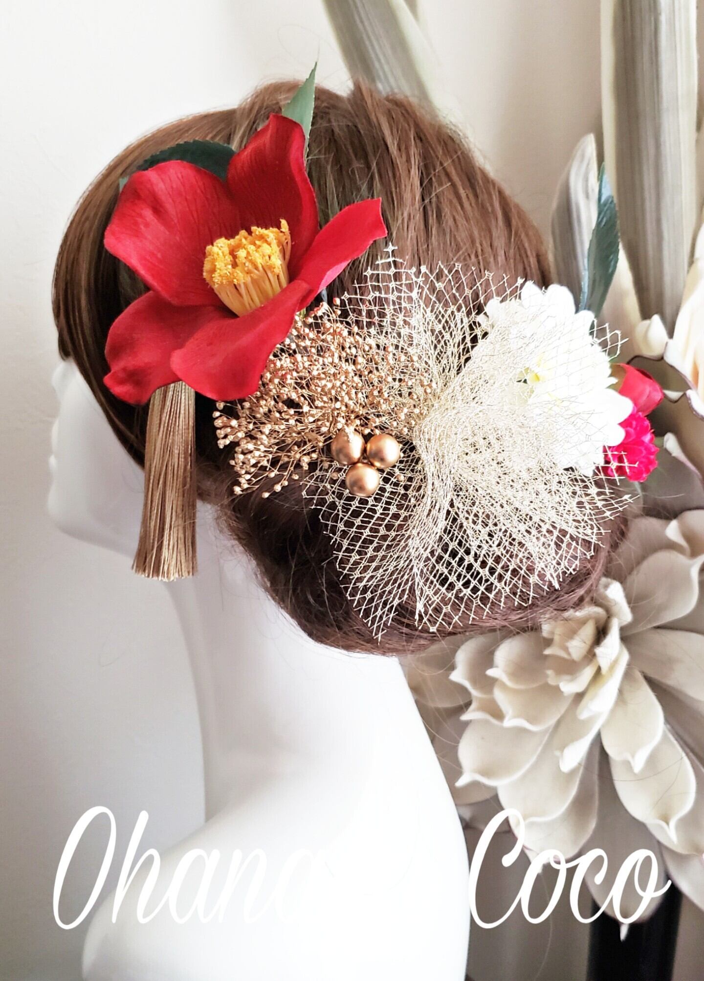 こちらの商品は花雅 大きな椿とゴールドかすみ草の髪飾り9点Setです。