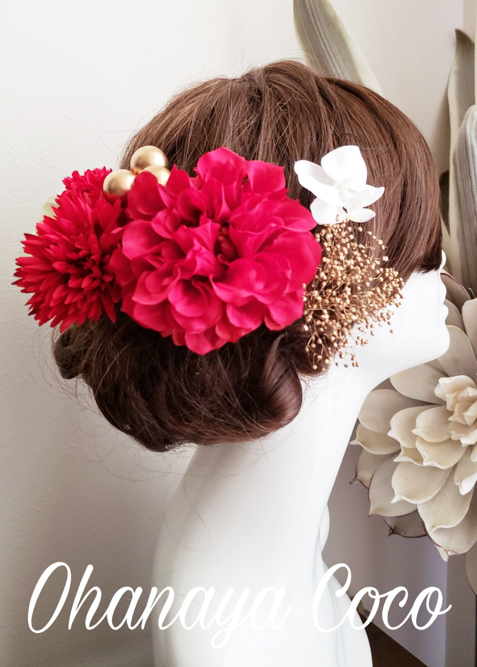 こちらの商品は花姫 真っ赤なダリアとマムの髪飾り7点Setです。
