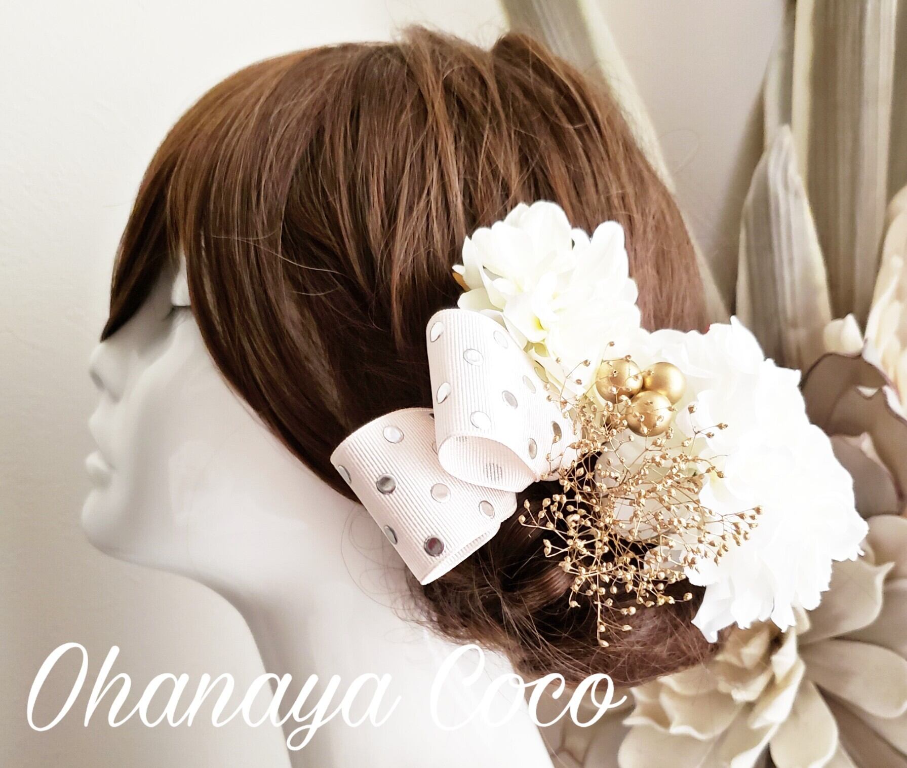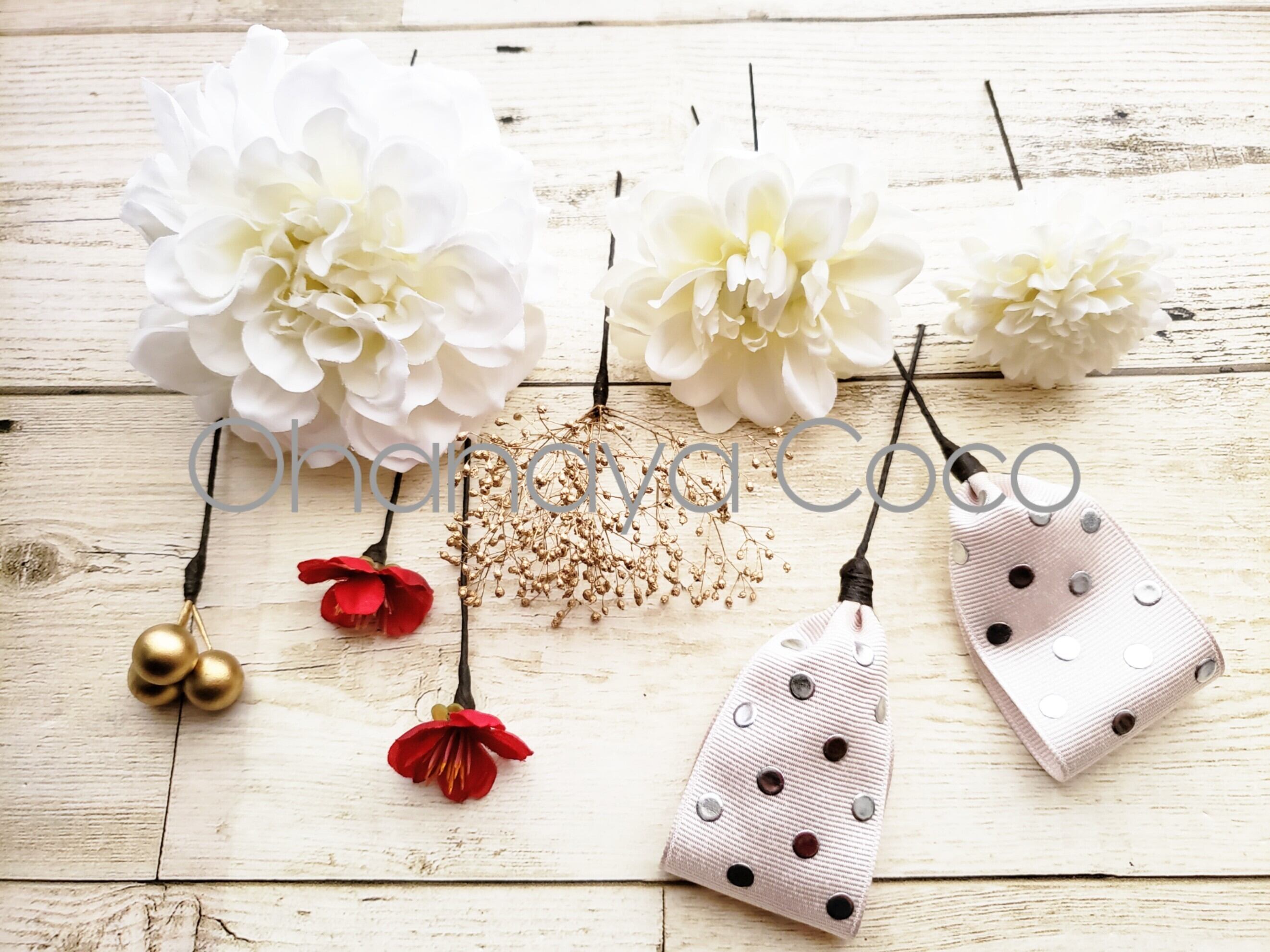 こちらの商品はゴールドかすみ草とwhite系ダリアの髪飾り9点Setです。