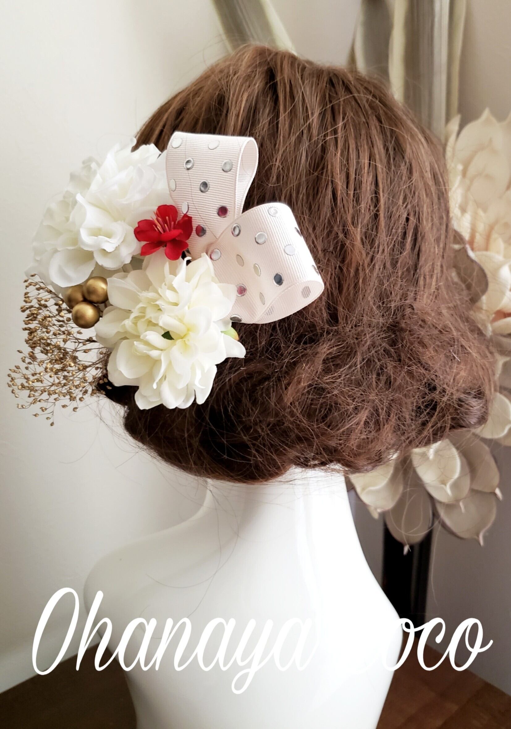 撮影角度などにより大きく見える場合もありますので実際の髪飾りの大きさは記載のサイズをご確認下さいませ。