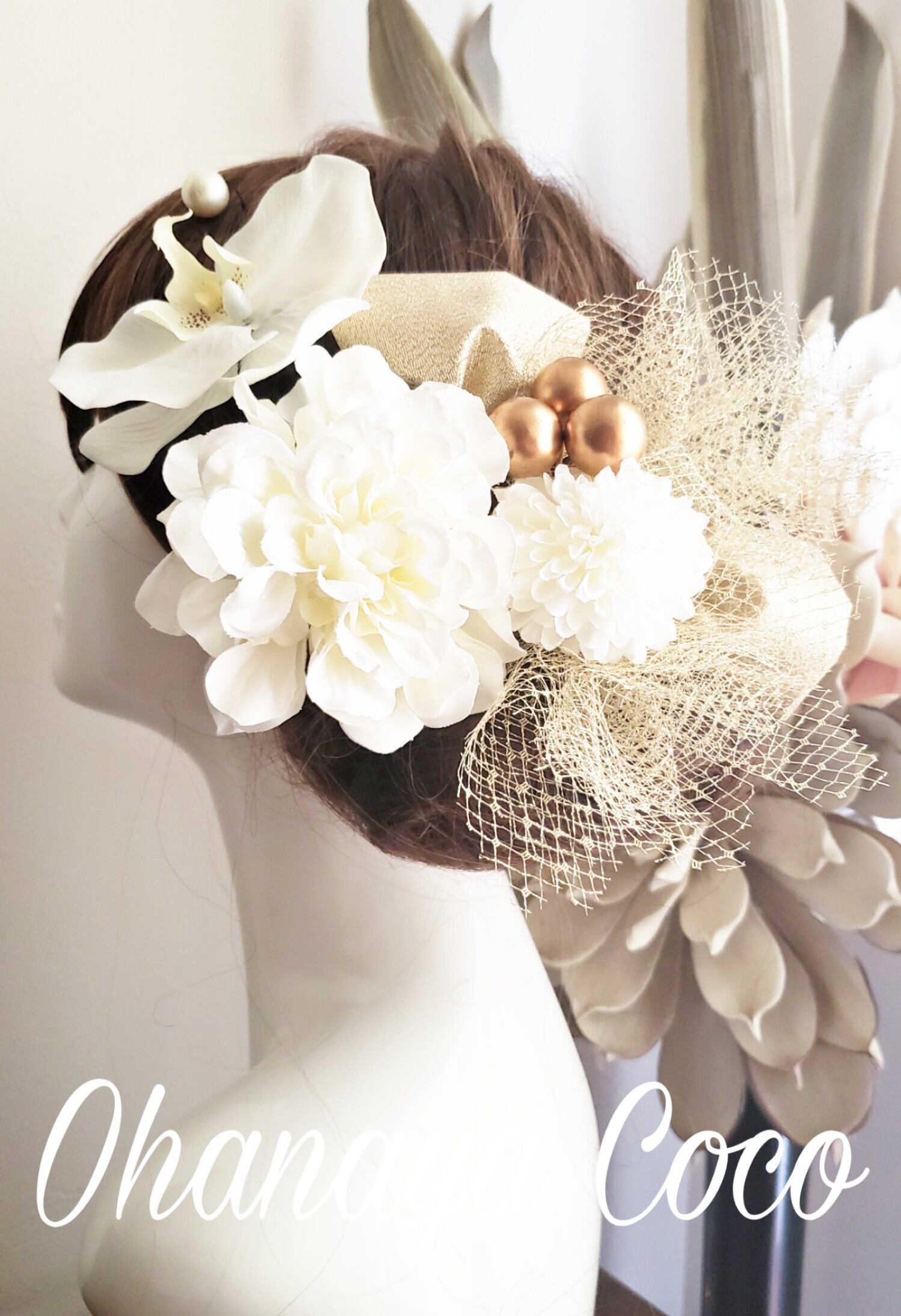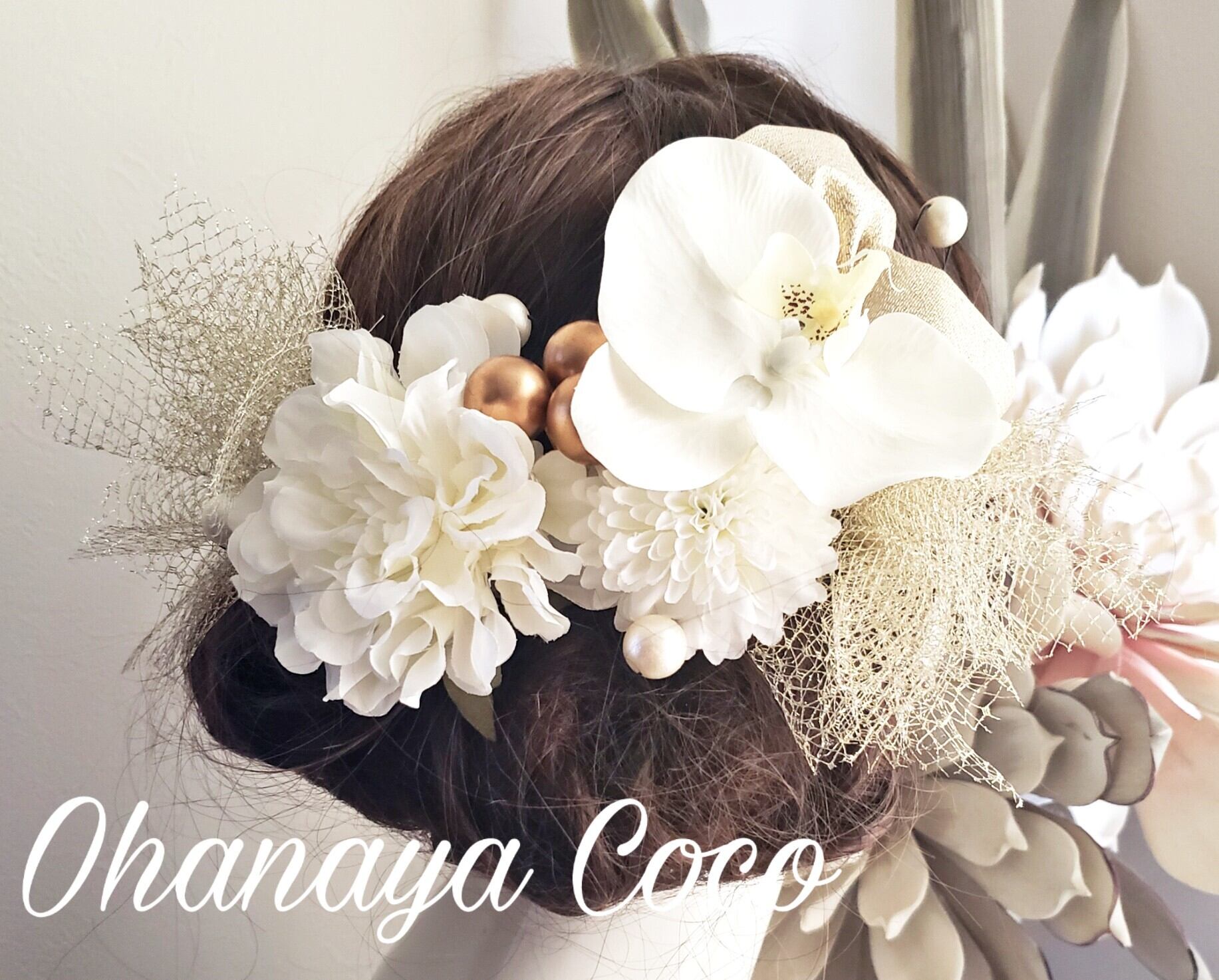 こちらの商品は 花kirari 真っ白ダリアと胡蝶蘭の髪飾り13点Setです。