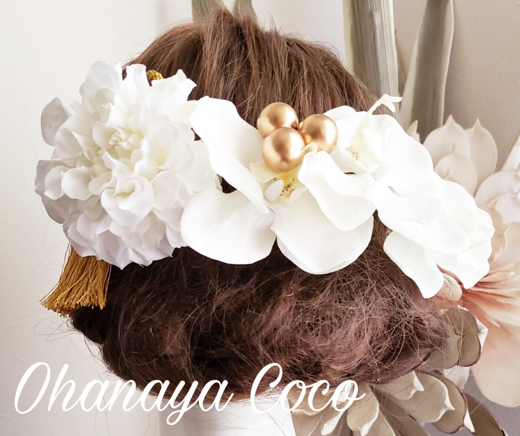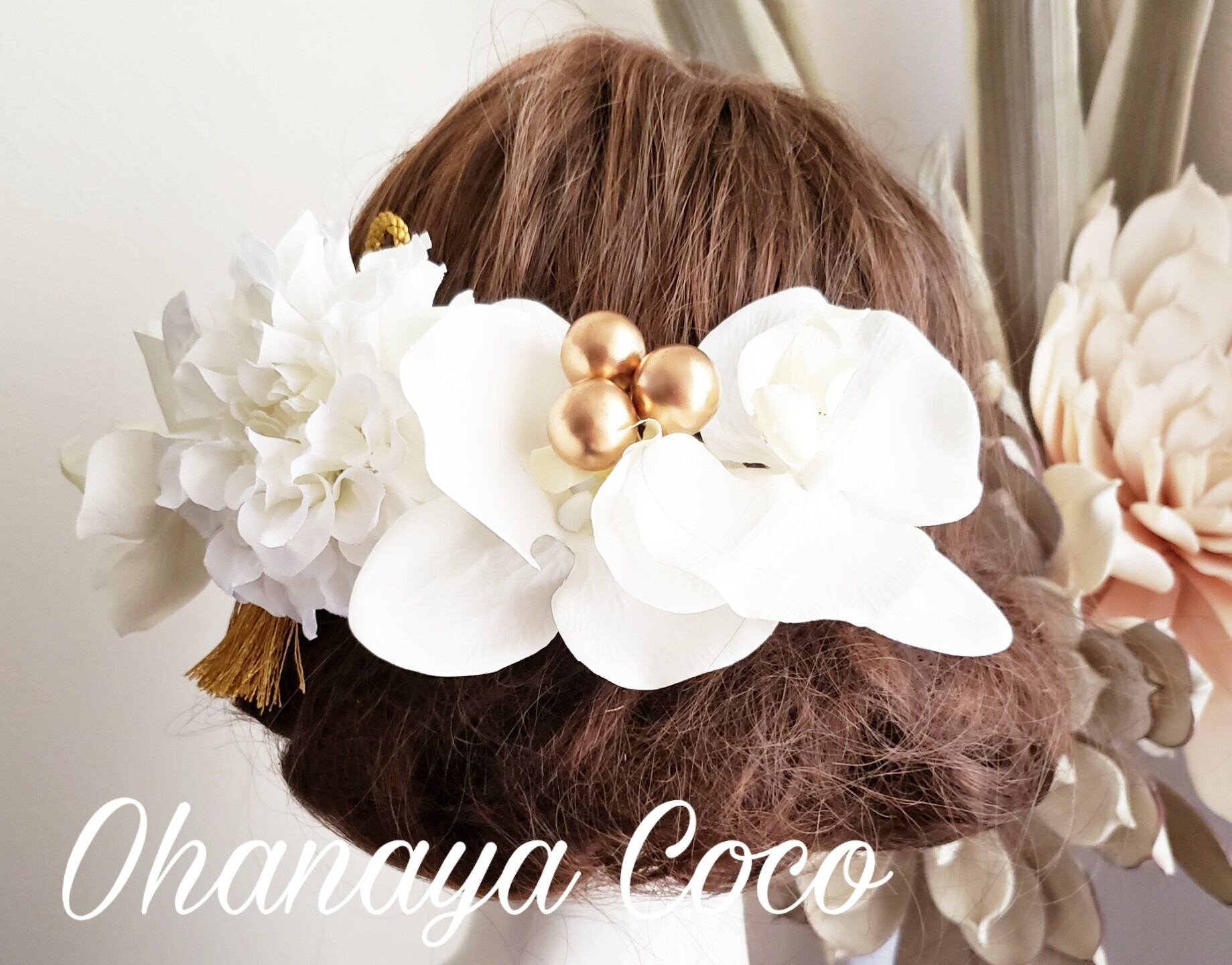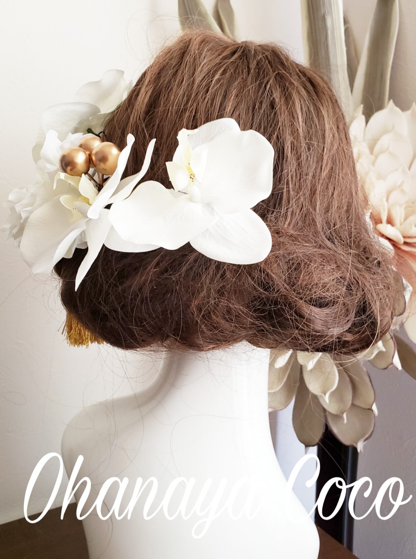こちらの商品は hirara胡蝶蘭とwhite系ダリアの髪飾り6点Setです。