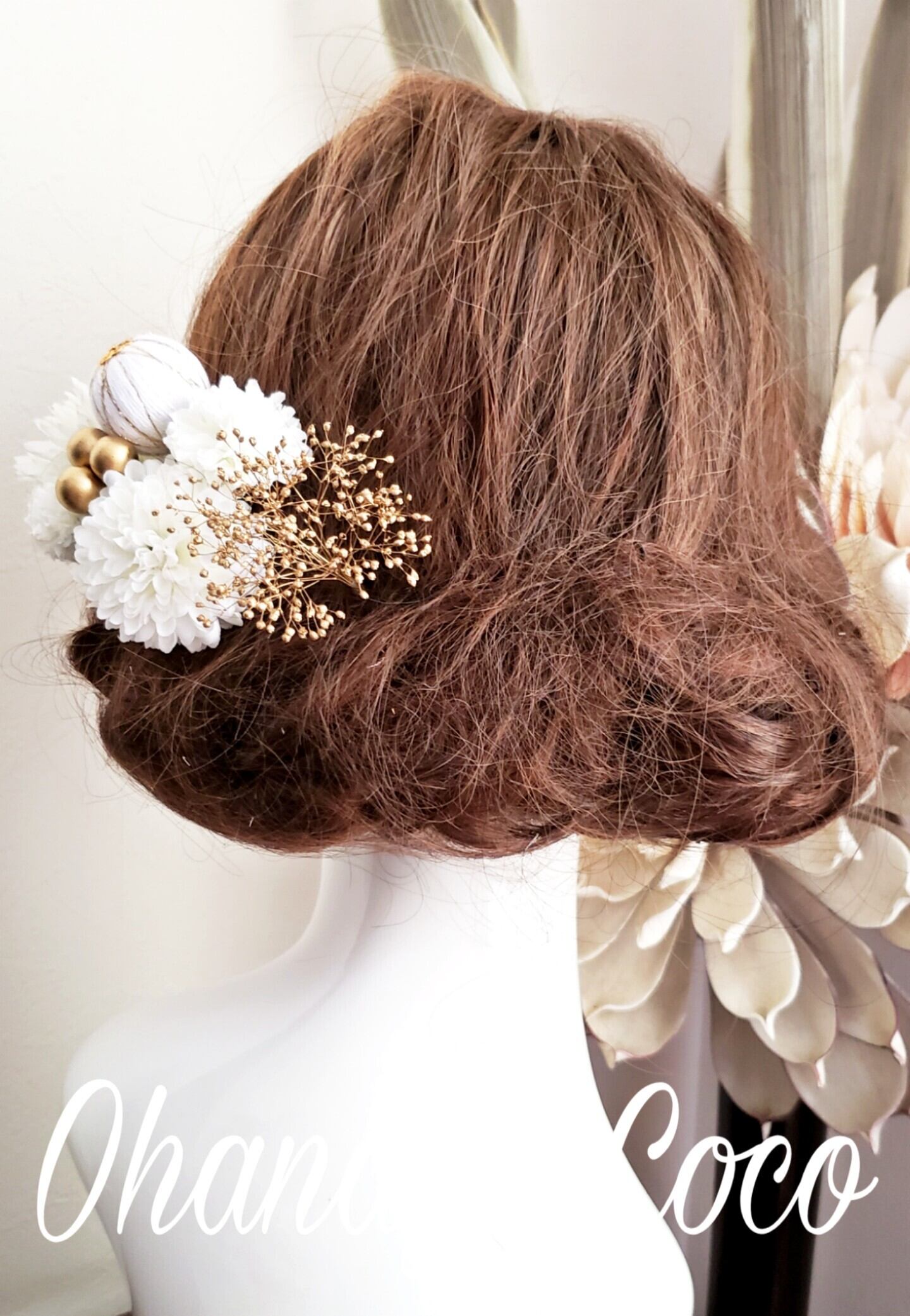 本物のお花のプリザーブドフラワーのかすみ草とアーティフィシャルフラワー(造花)を使用した高級感のある素敵な髪飾りです。