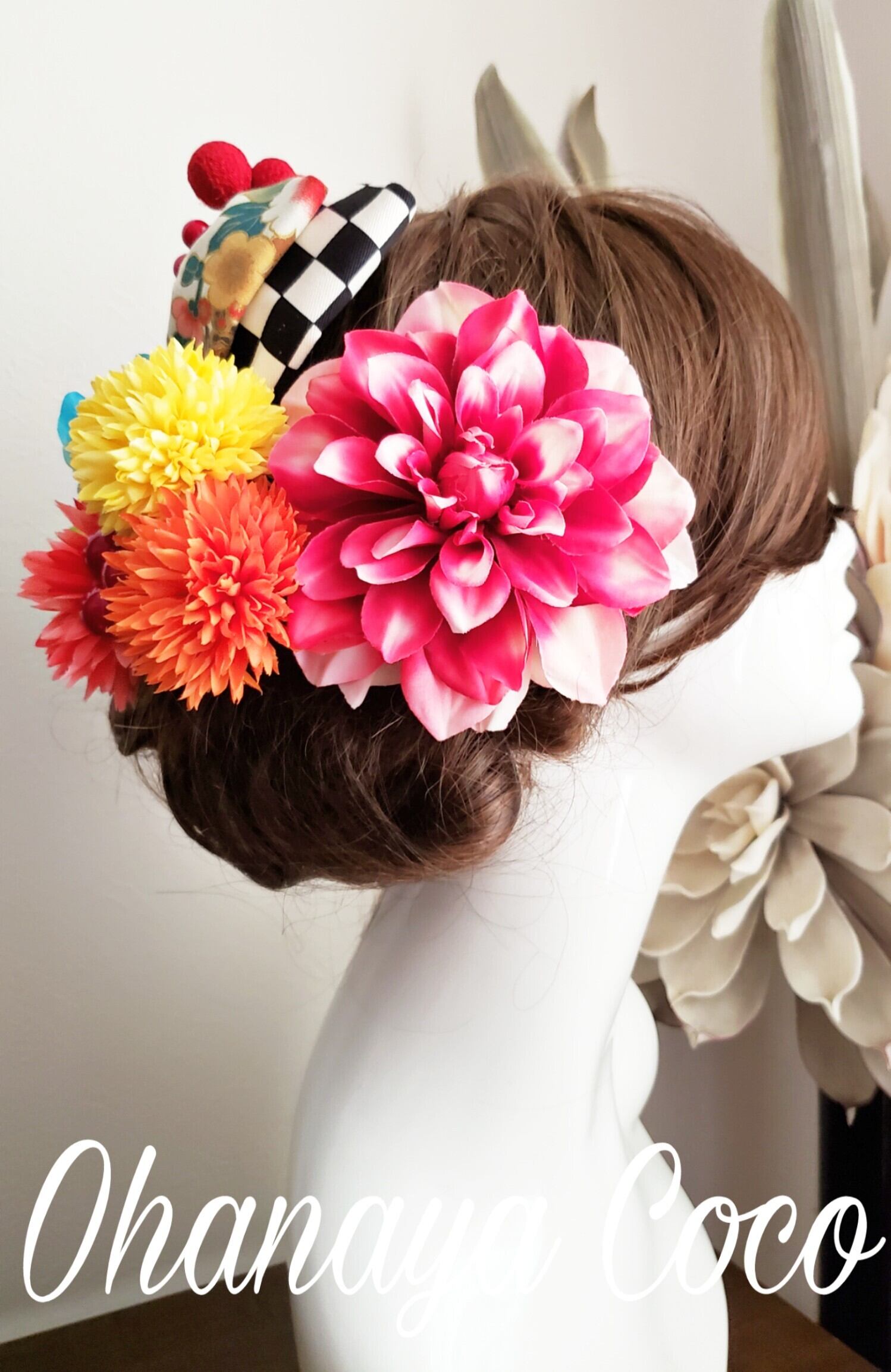 グラデーションダリアと和柄リボンの髪飾り8点Set No747 成人式 結婚式