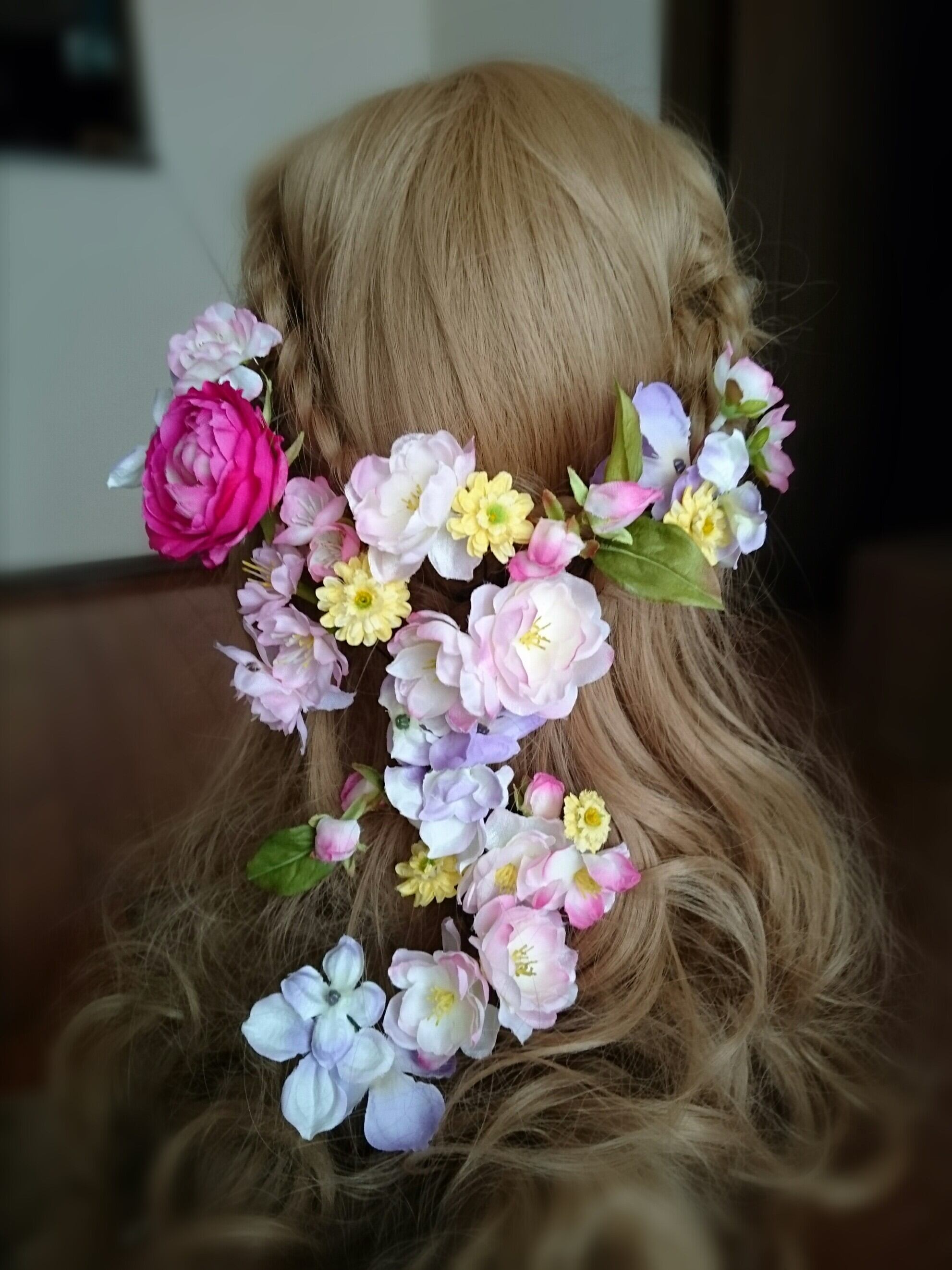 可愛らしいお花のピックが17点入っていますので緩く編み込んで