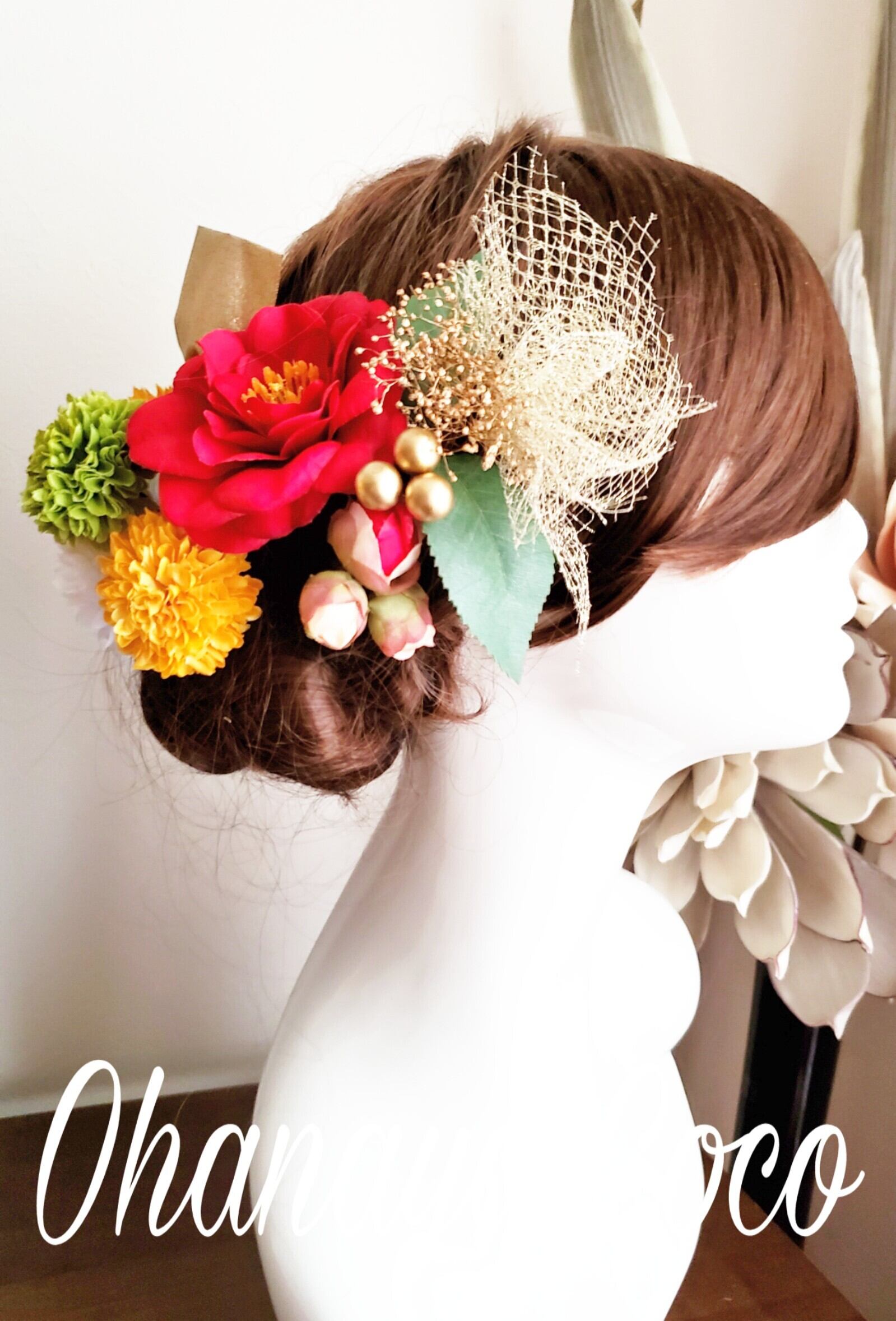花姫 椿とマムの髪飾り12点Set No757 成人式 袴 色打掛