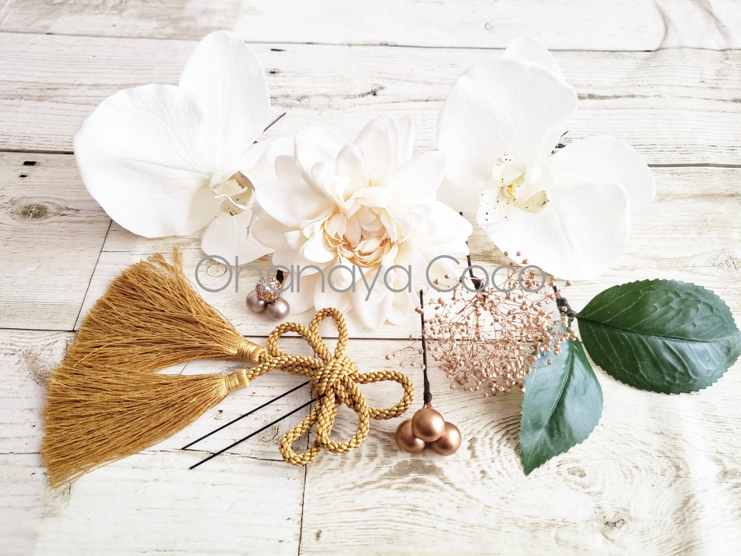 こちらの商品は大きな胡蝶蘭とゴールドかすみ草の髪飾り8点Set です。