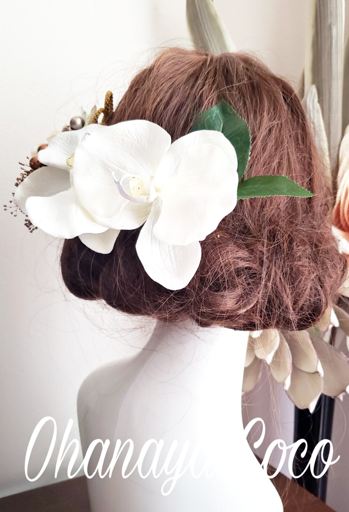 本物のお花のプリザーブドフラワーのかすみ草、アーティフィシャルフラワー(造花)の胡蝶蘭を使用した高級感のある大人な雰囲気が素敵な髪飾りです。