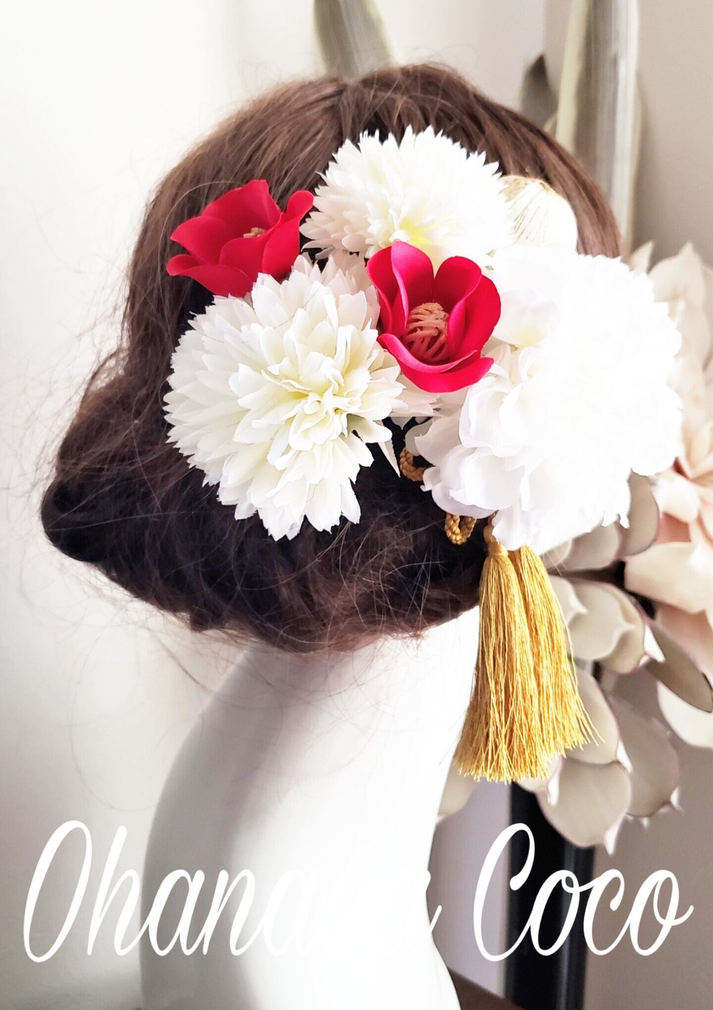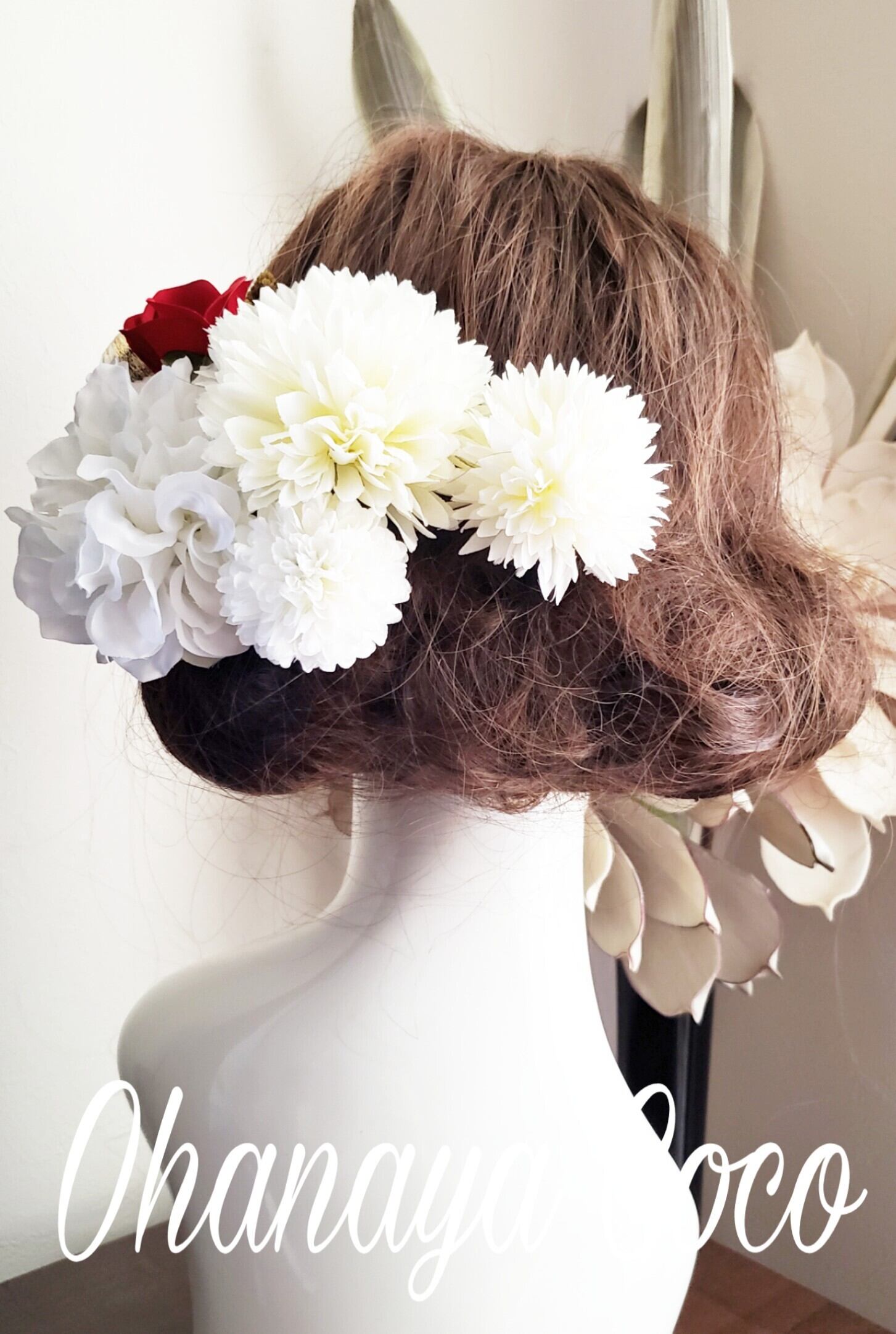 こちらの商品は 小さな赤い椿と真っ白ダリアの髪飾り8点Setです。