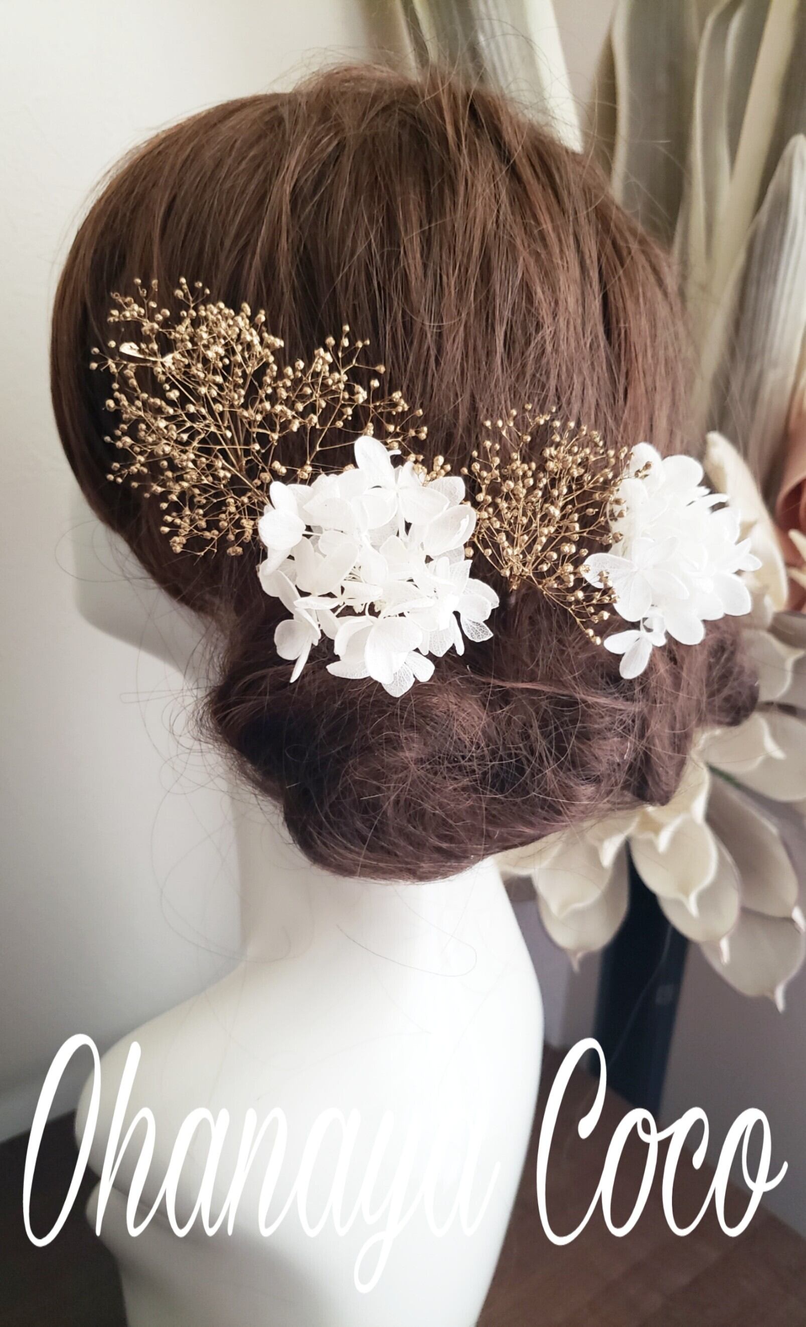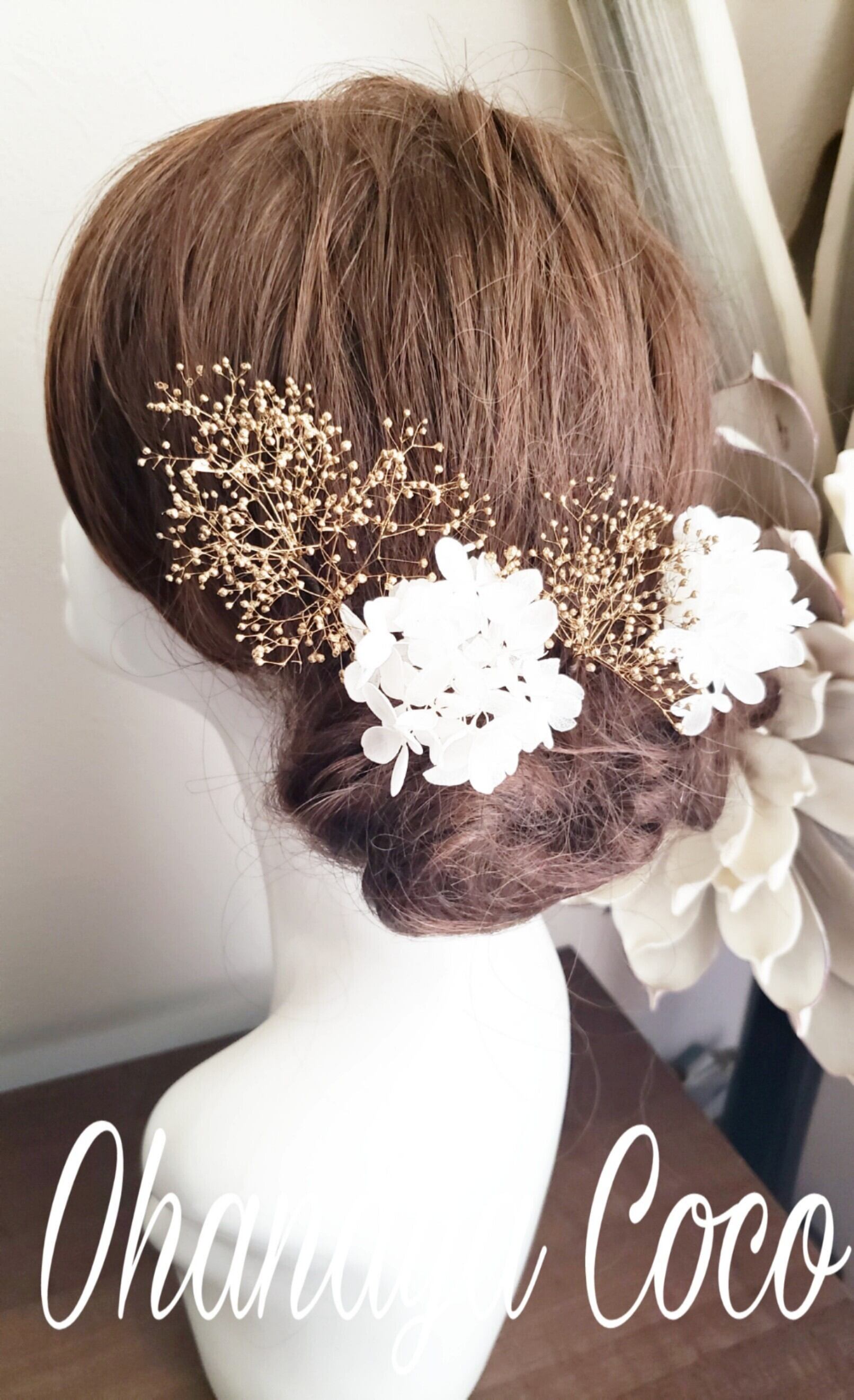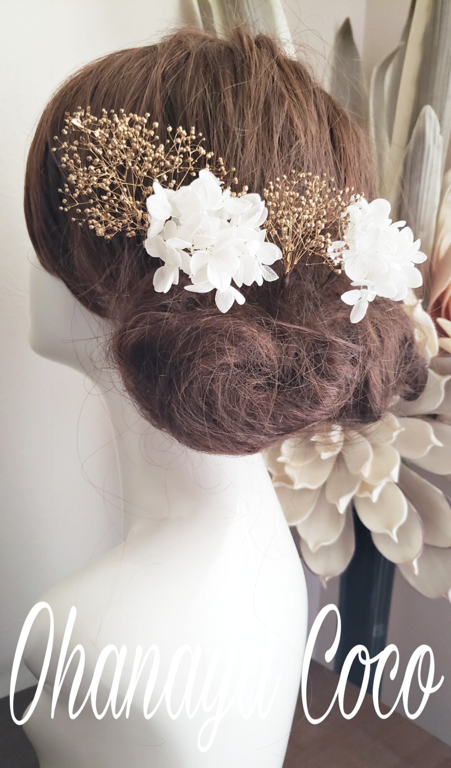 こちらの商品はプリザーブドフラワーの紫陽花とゴールドかすみ草の髪飾り5点Set です。