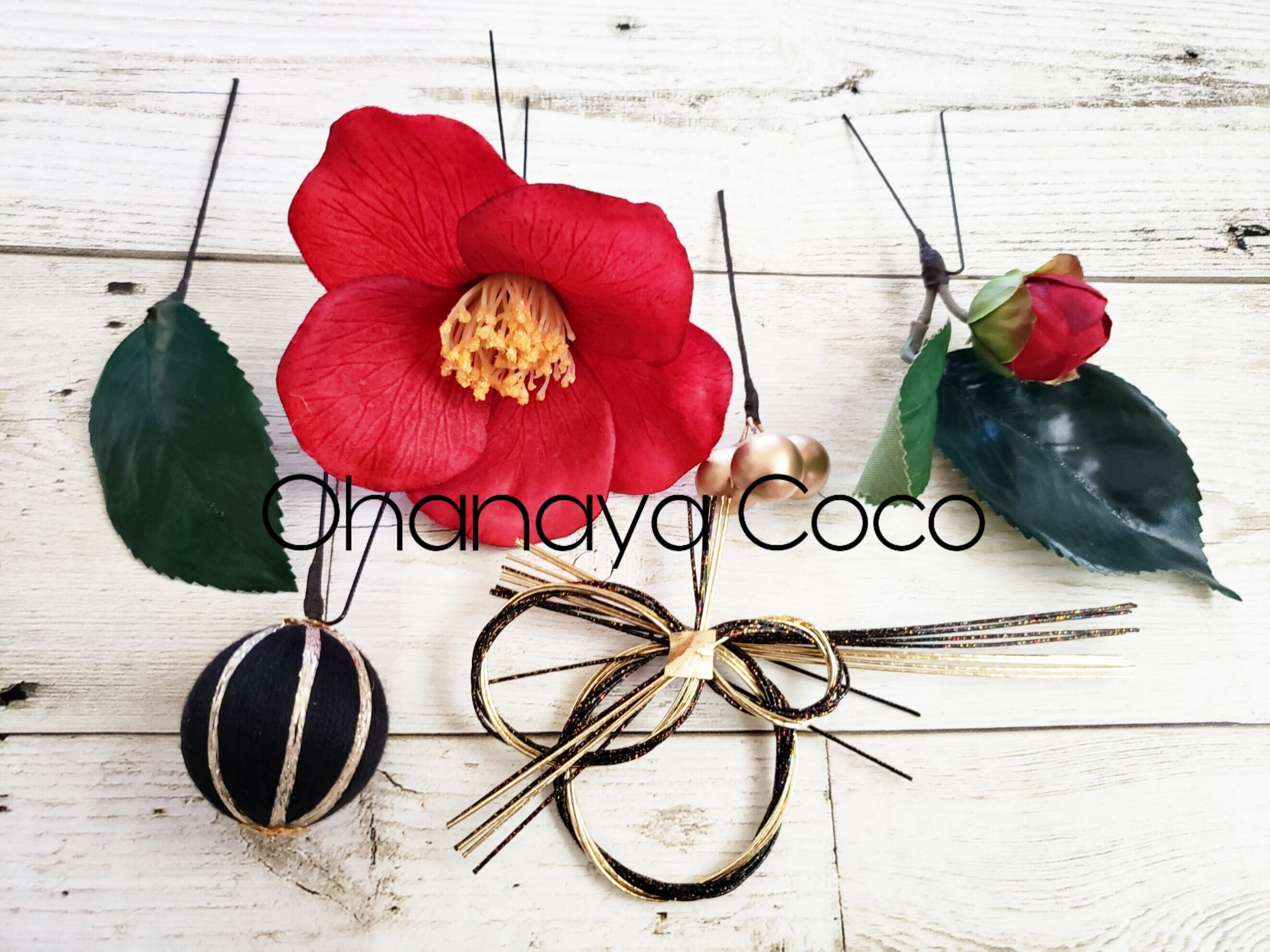 江戸椿と和玉ボールの髪飾り6点Setです。