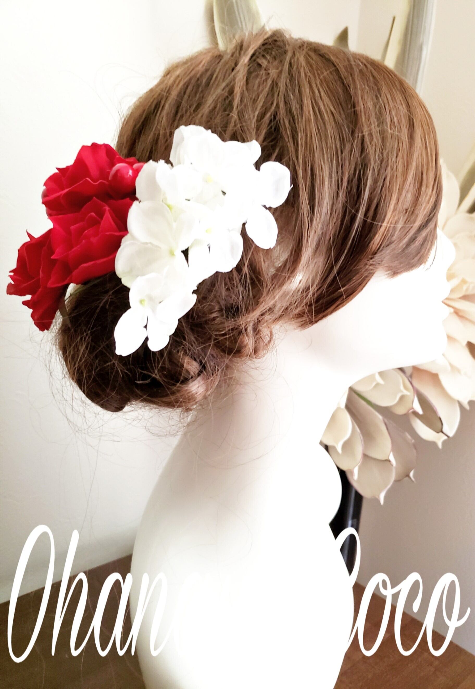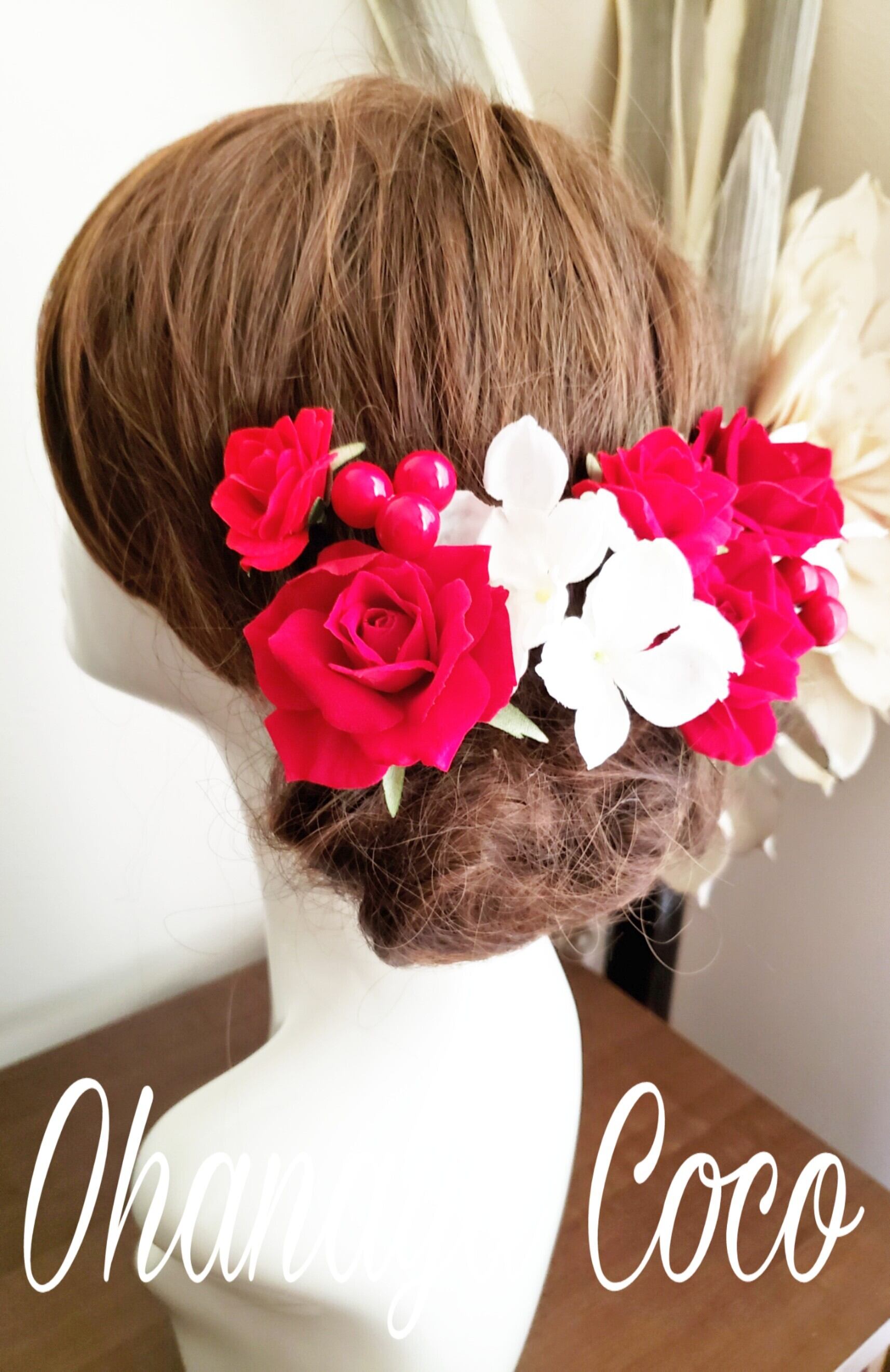 こちらの商品は真っ赤な薔薇と真っ白紫陽花の髪飾り9点Setです。