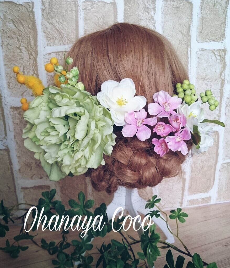 春色パステルグリーンの髪飾り8点Set No103 ウェディング