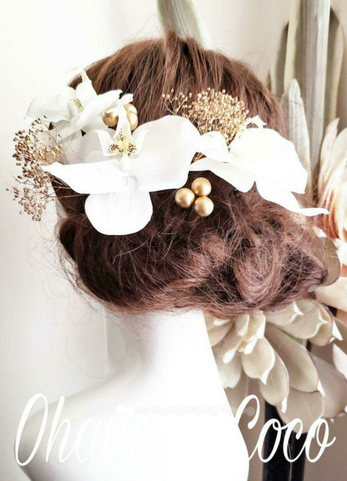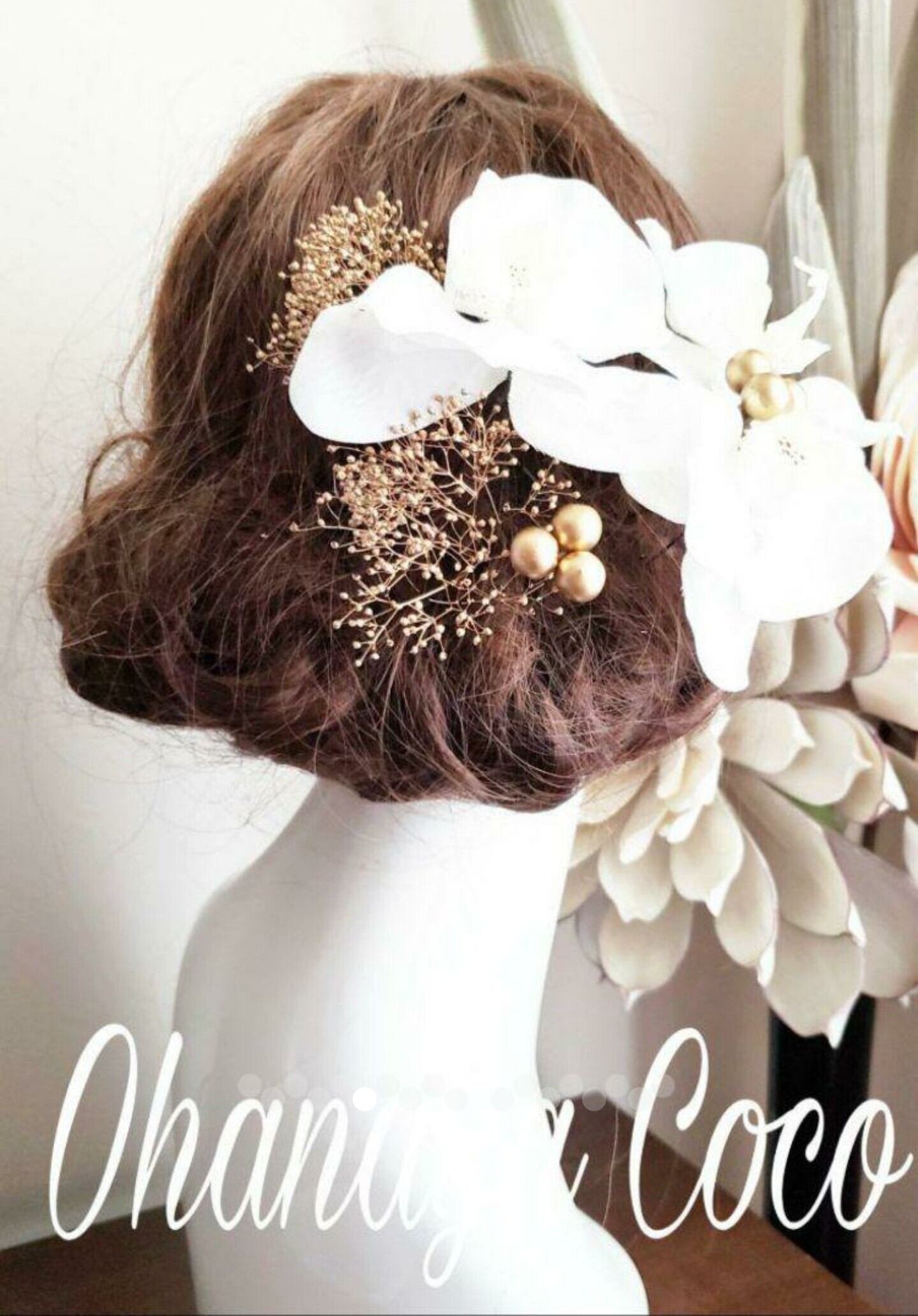 本物のお花のプリザーブドフラワーのかすみ草、アーティフィシャルフラワー(造花)の胡蝶蘭を使用した高級感のある大人な雰囲気が素敵な髪飾りです。