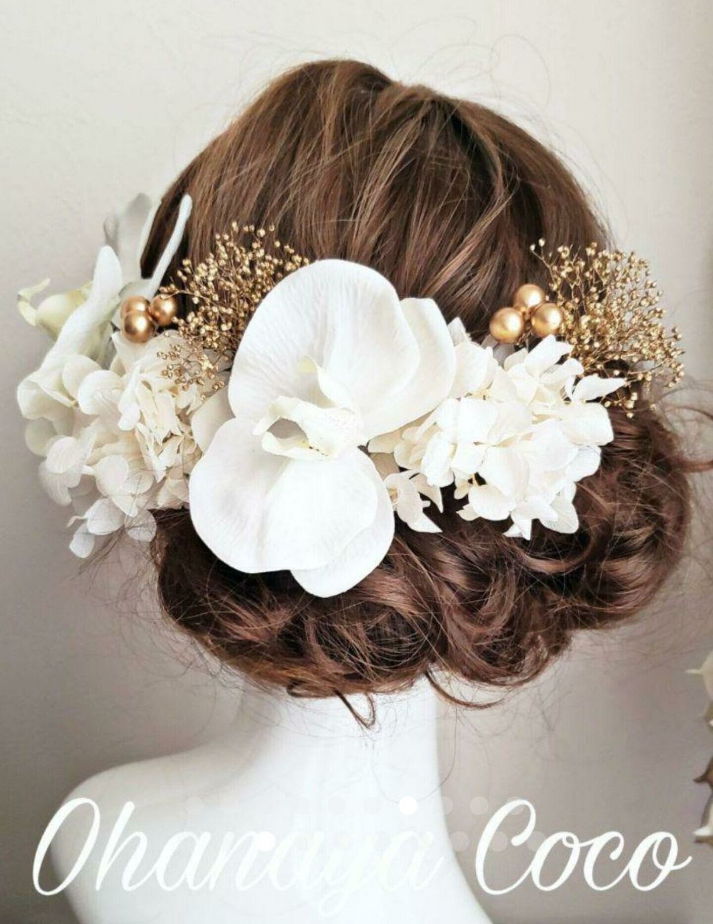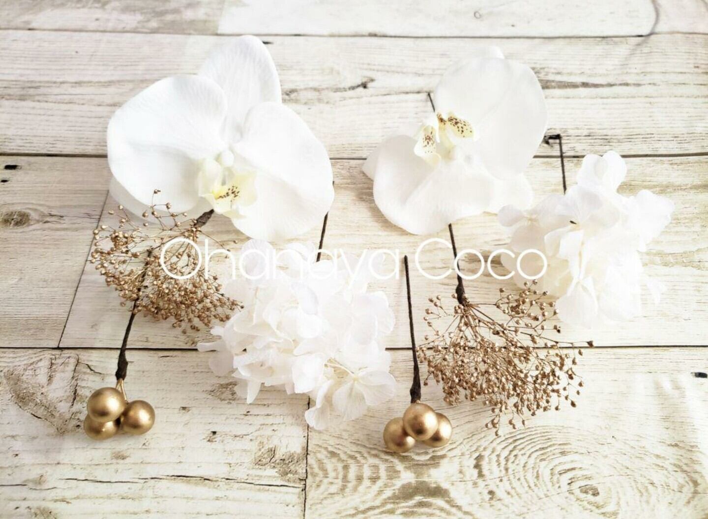 こちらの商品はhirahira 蝶舞う胡蝶蘭とゴールドかすみ草の髪飾り8点Set です。