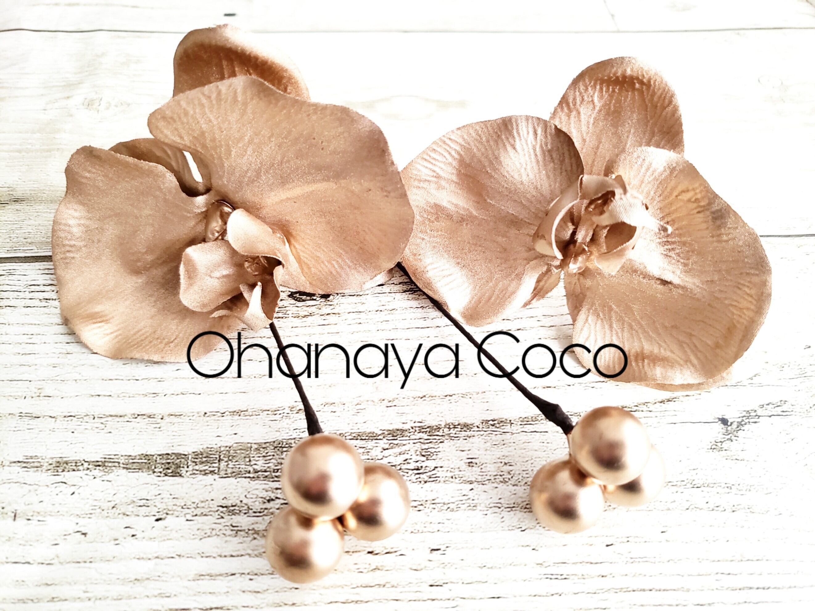 こちらの商品はhirahira胡蝶蘭とゴールドベリーの髪飾り4点Setです。