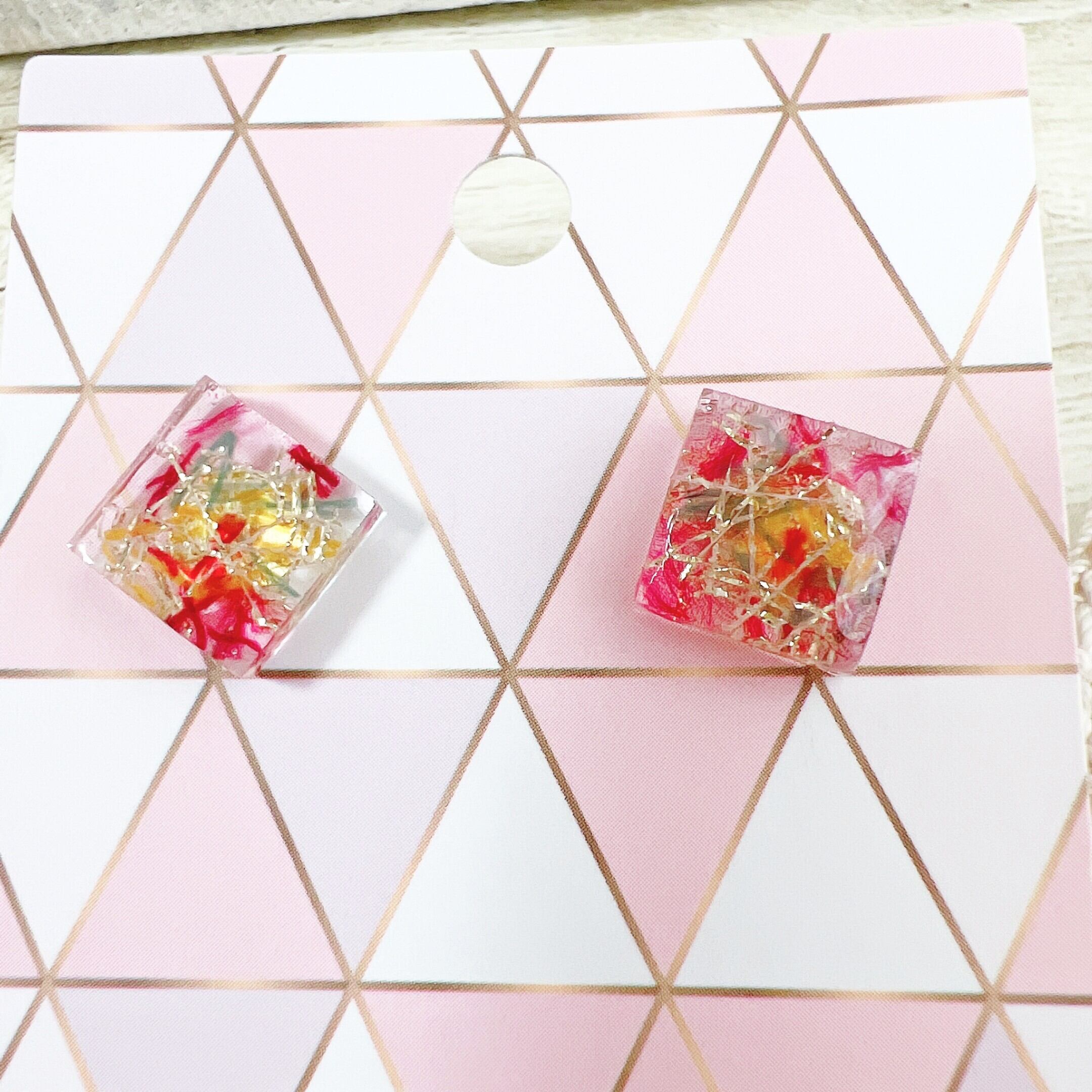 透明なレジン液の中にカラフルに色付けしたパーツを埋め込みました。