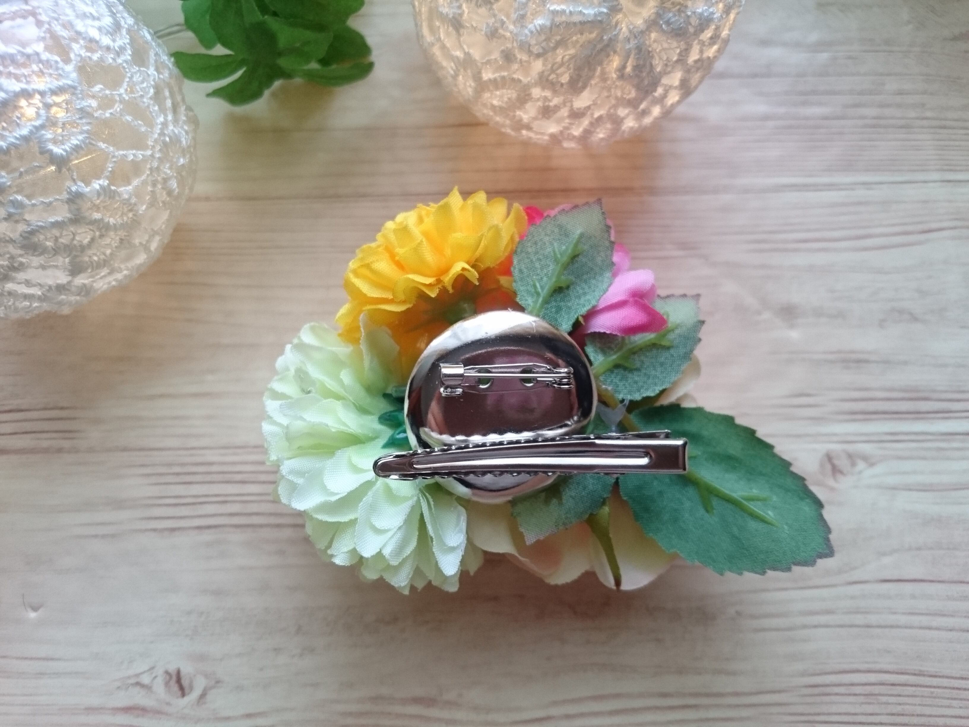 3wayタイプヘアクリップはクリップとコサージュ用のピンが付いた金具で、髪飾り、コサージュ、バックチャームとしてご利用頂けます。