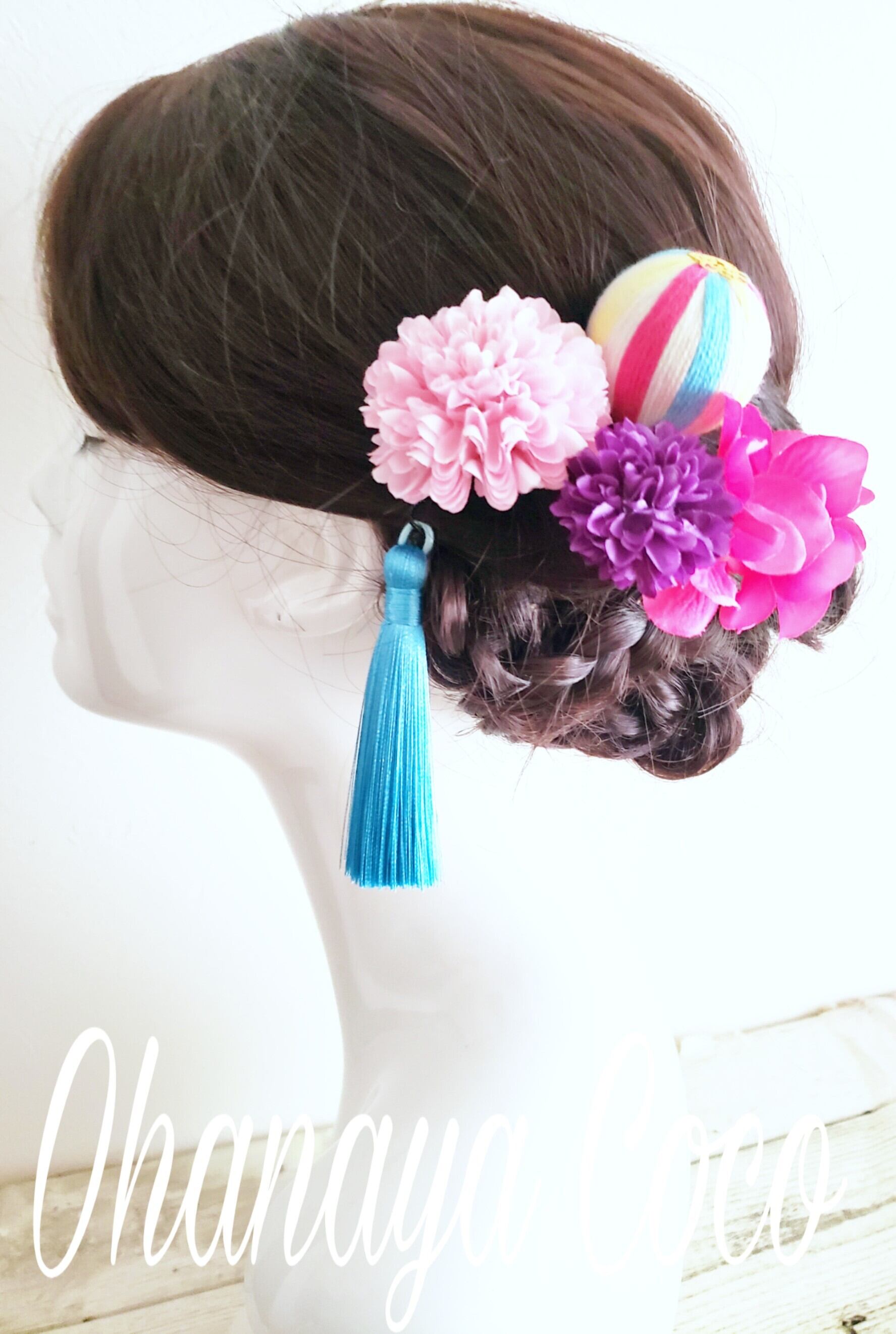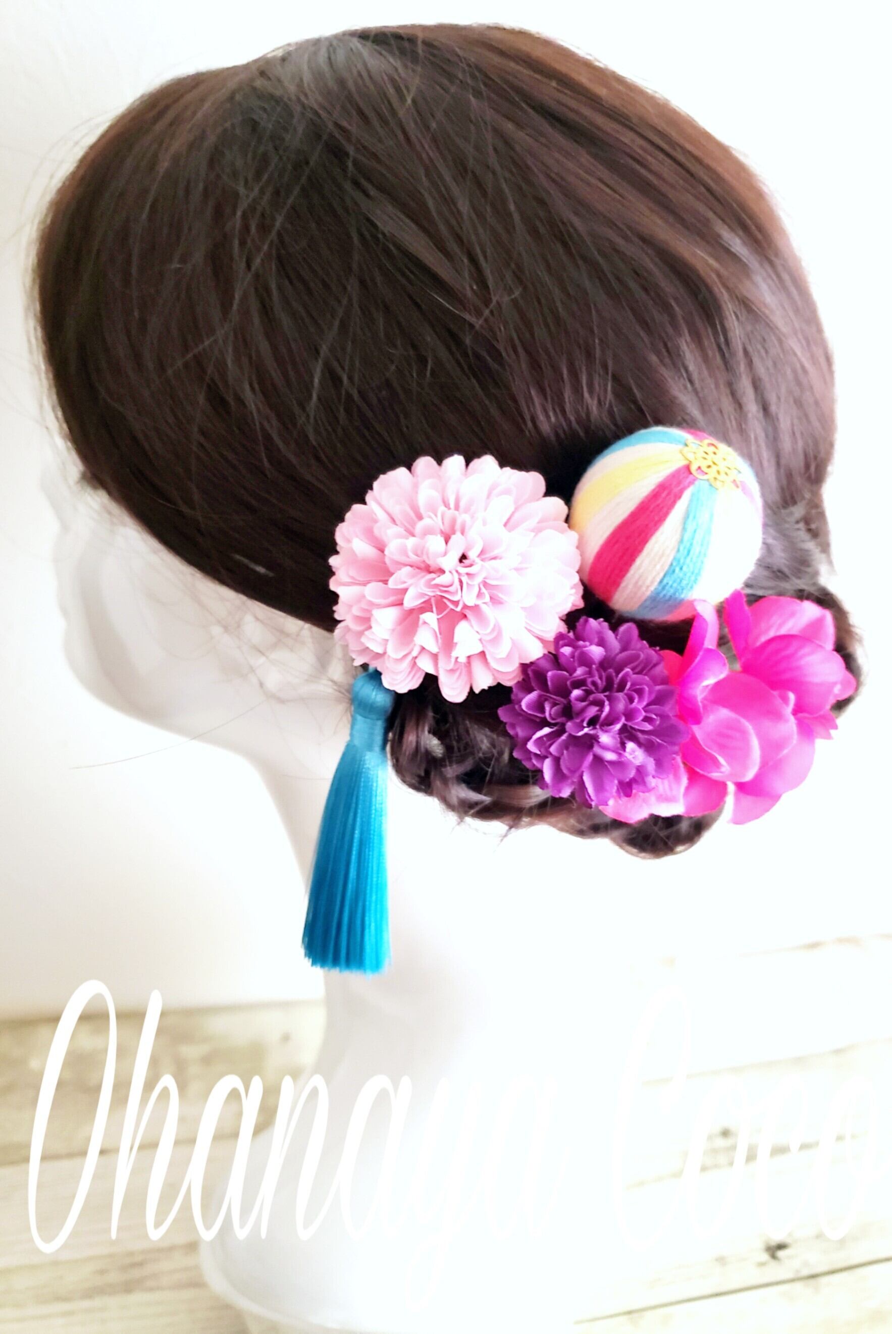 ポイントの和玉ボールはカラフルな刺繍糸を丁寧に巻き付けて可愛いく仕上げました。