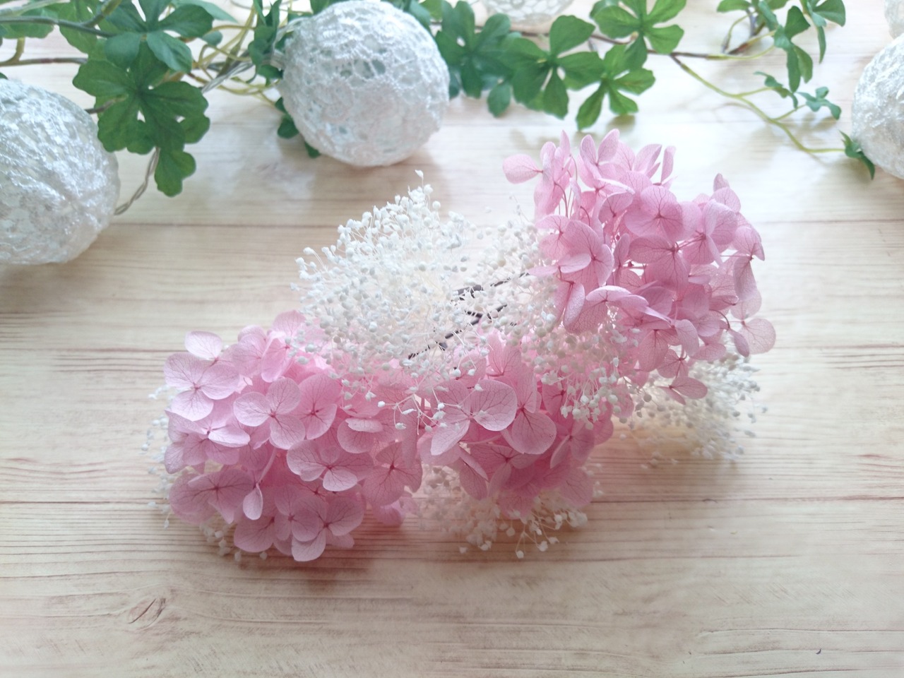 かすみ草と紫陽花は特殊な液で加工されたプリザーブドフラワーを使用しましたのでより華やかな雰囲気です。(プリザはとても繊細のため取り扱いにご注意下さい)