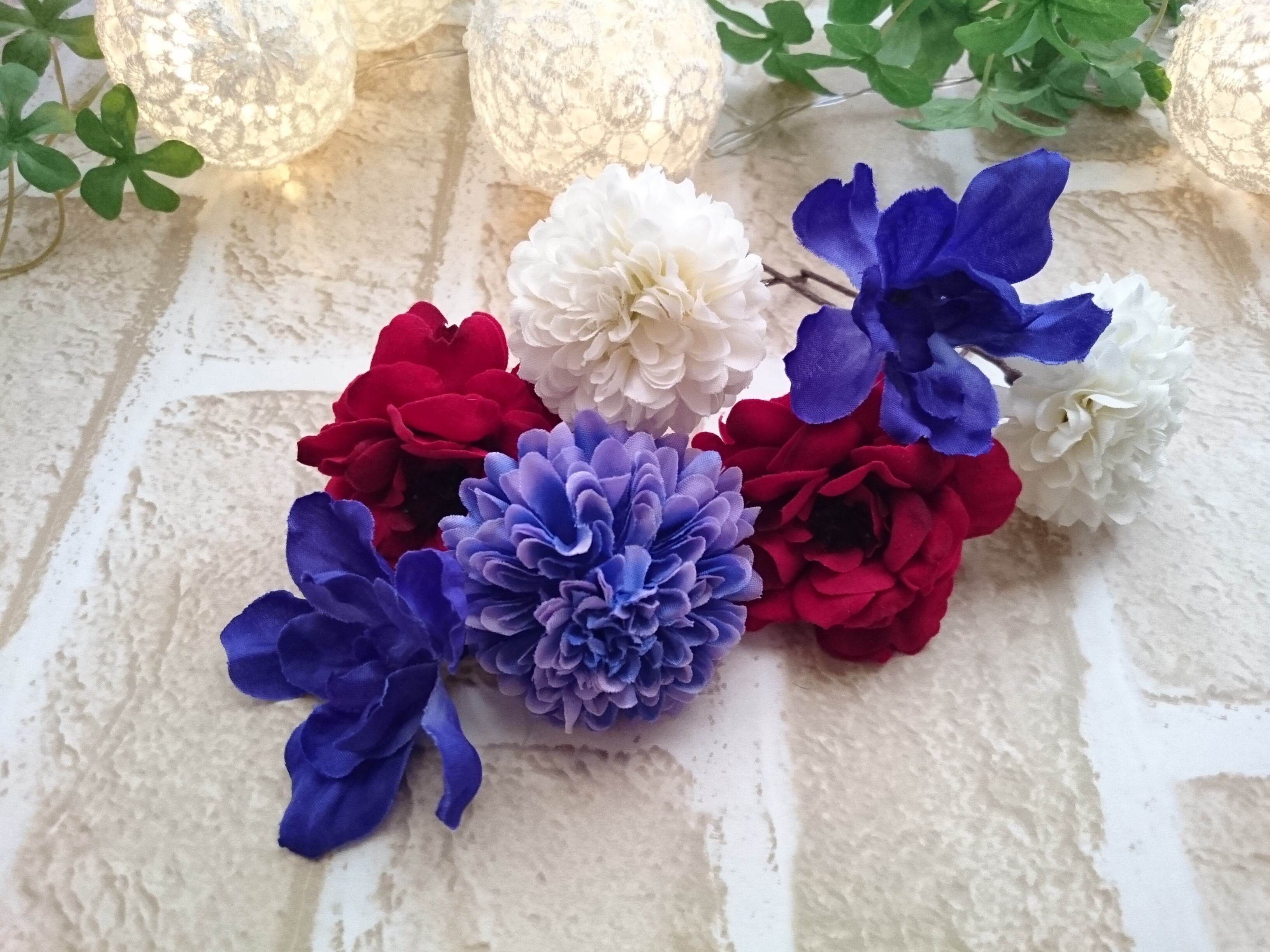 こちらの商品は真っ赤な薔薇と青いマムの髪飾り7点set です。。