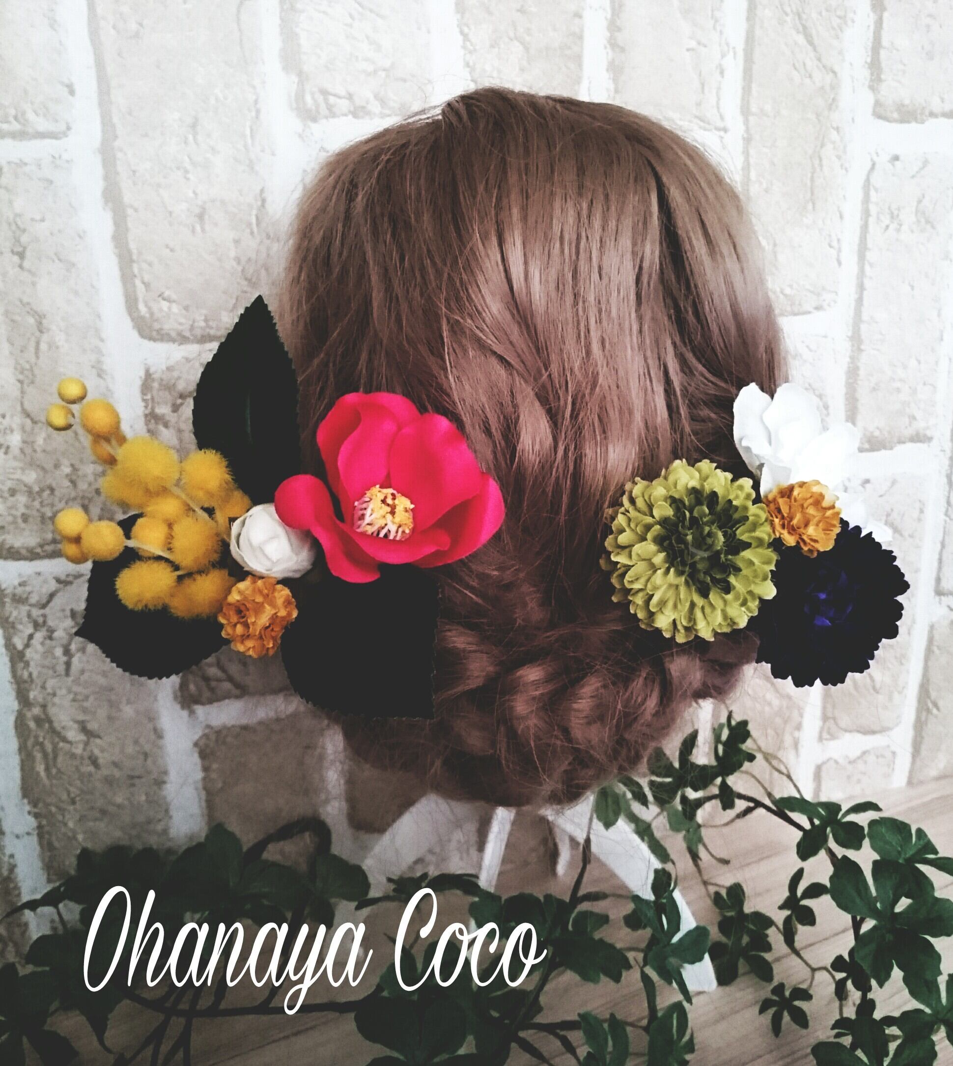 こちらの商品は和風モダン 椿とミモザの髪飾り8点Setです。