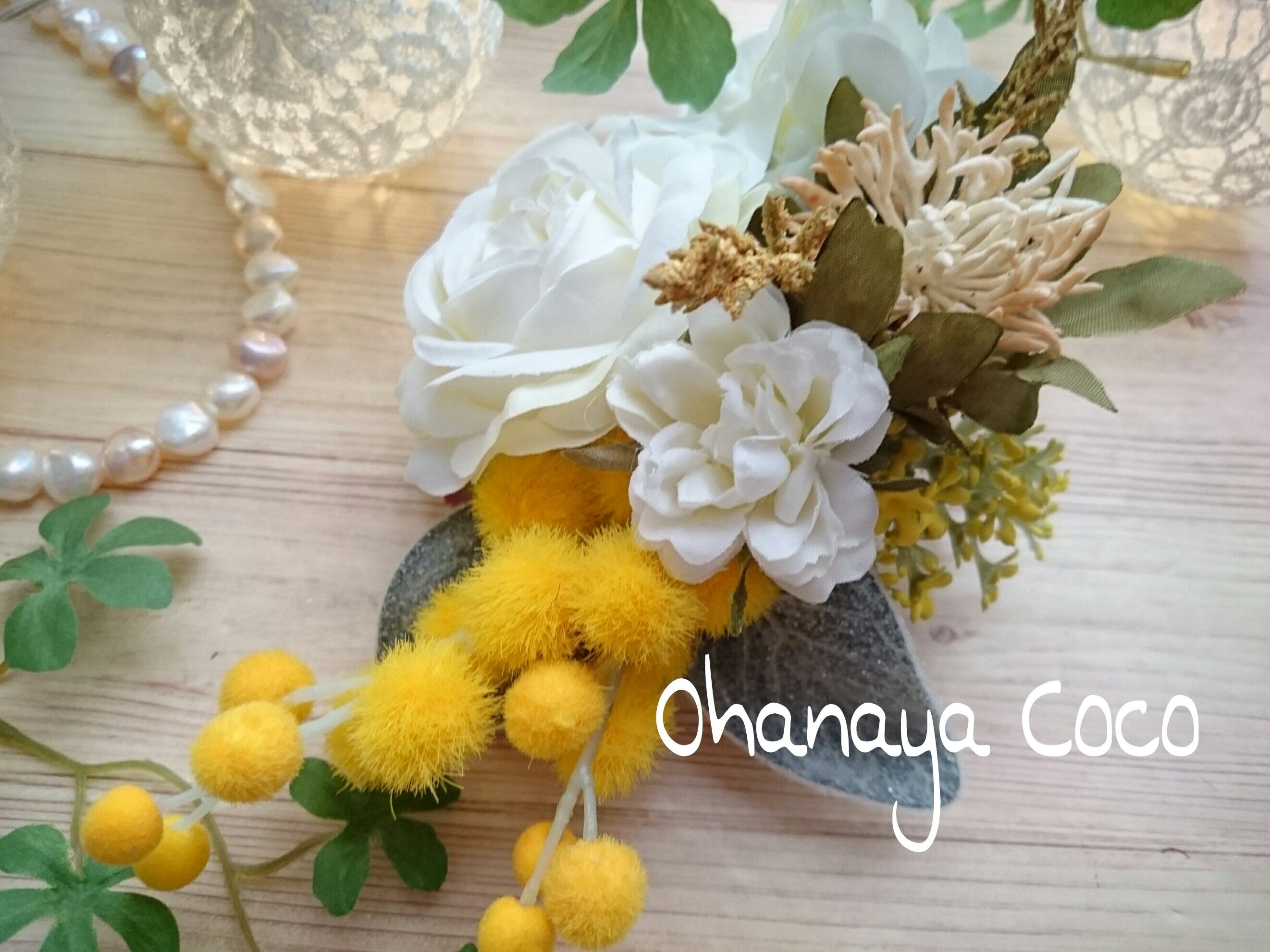 こちらの商品はミモザとブルームのコサージュ2wayタイプです。