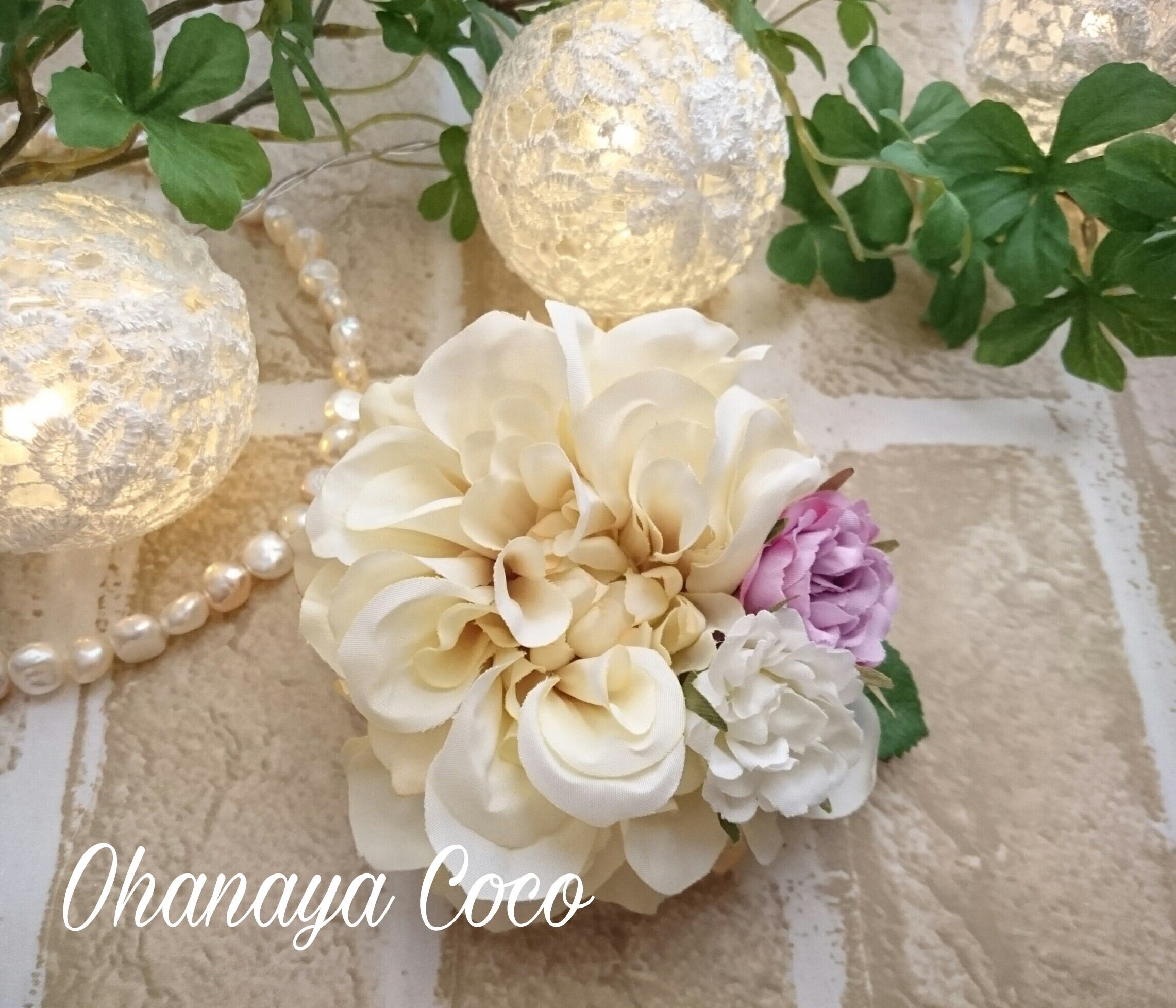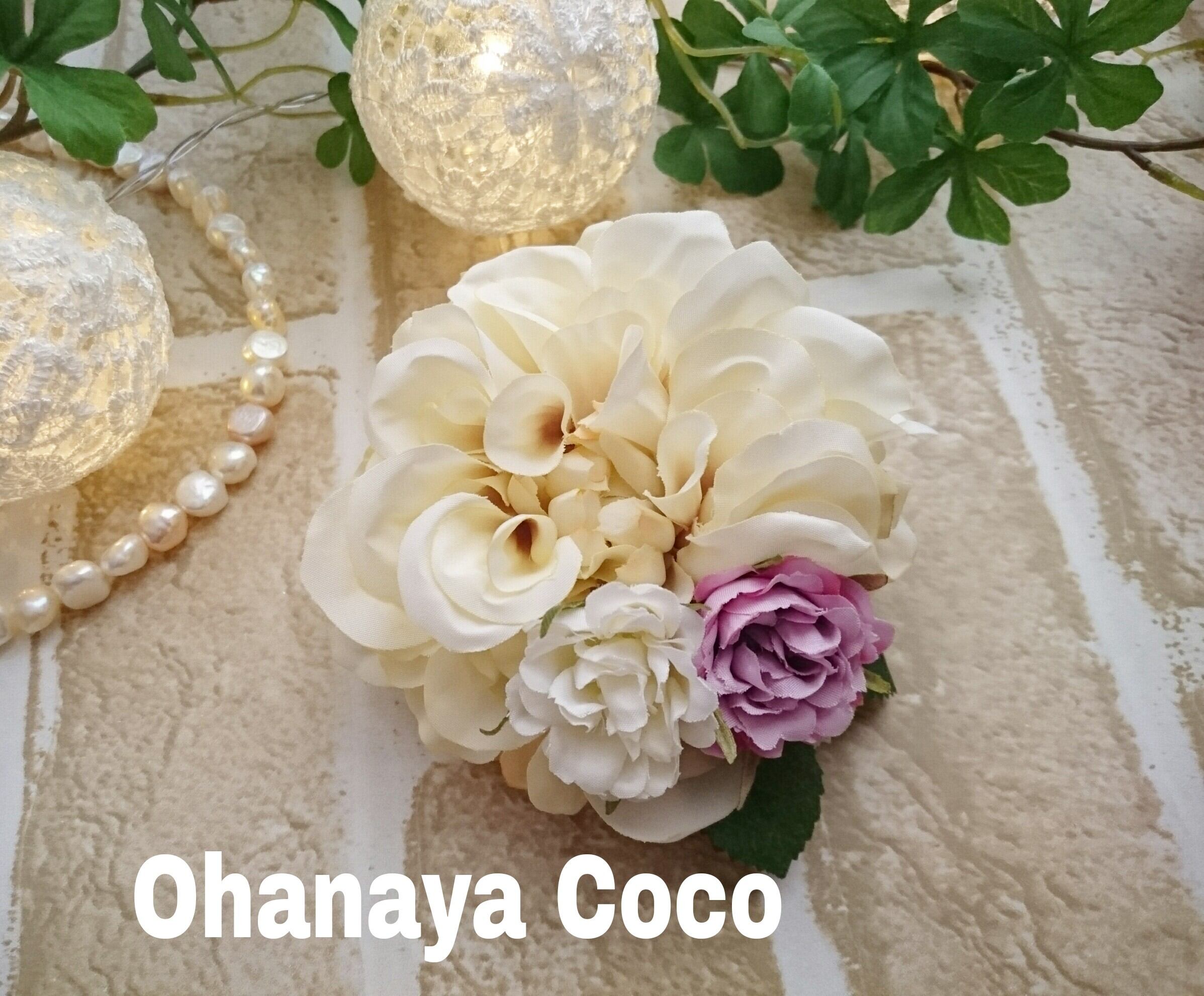 こちらの商品はwhiteとダリアとローズのコサージュ2wayタイプです。